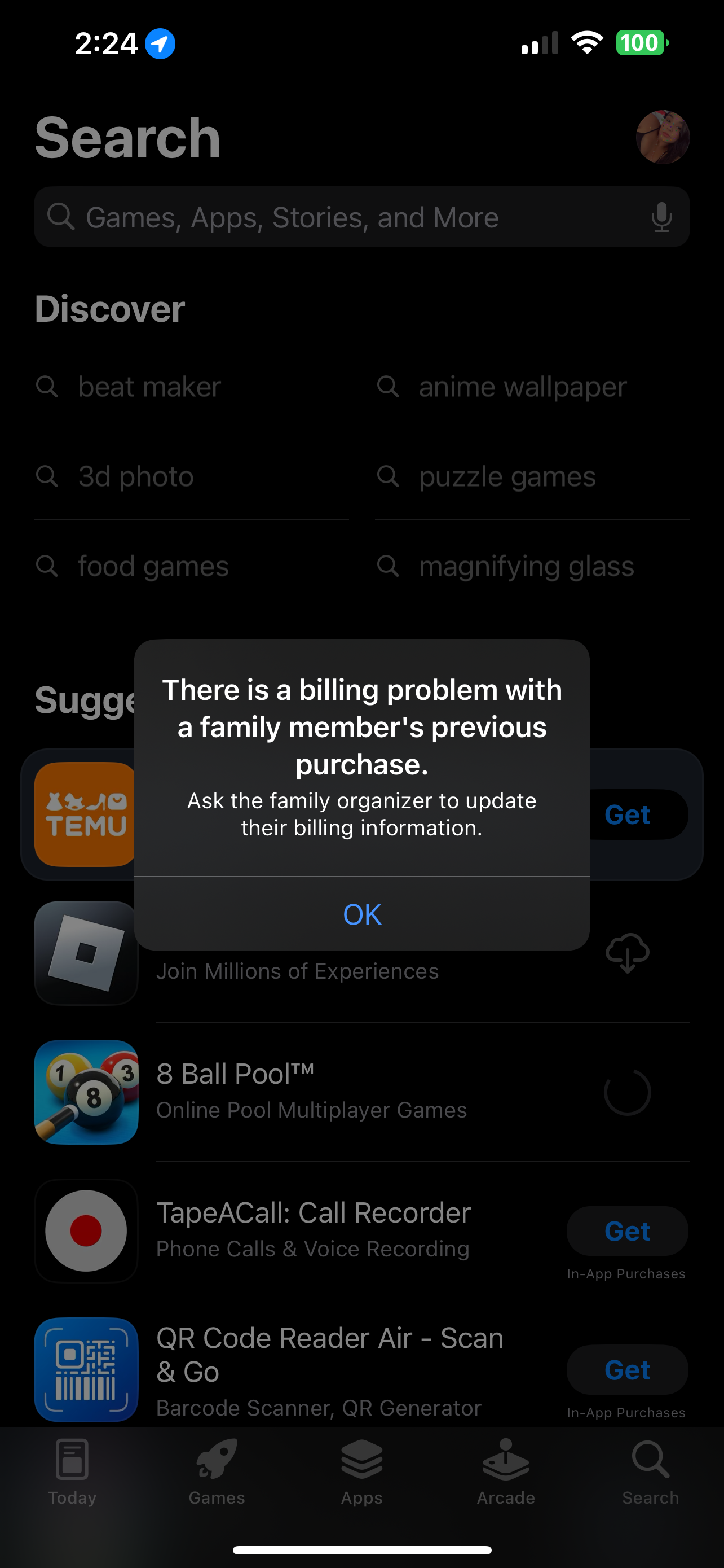 What if I try to download a app and it declines it because it says there is a billing problem with a family members previous purchase how do I take that off