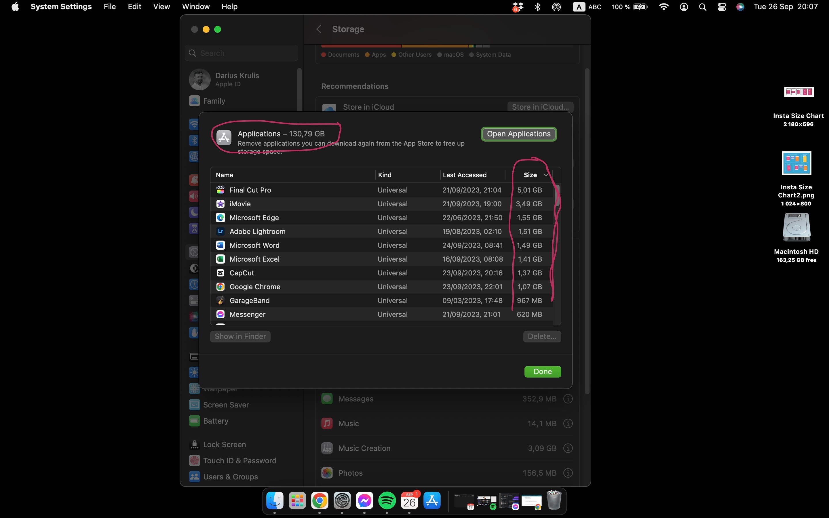 I cannot understand why applications in my storage takes so much space. It does not make sense to me. In the storage you can see that it app takes 130,79GB. But when I open application folder you can see that the biggest app has 5,01 GB and others has less. Total it is less then 20GB.