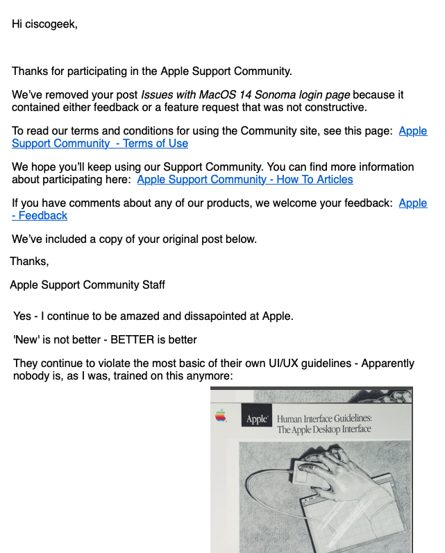Seems like nobody actually uses these before making these kinds of changes. Time would be better spent on fixing apps like Itunes/Music and Mail. Tiny font, hiding sleep/restart/shutdown buttons in a tiny menu upper right. I'd say that's not how I was trained in UI/UX guidelines as an Apple developer, but then I'd probably get my post taken down again like this: