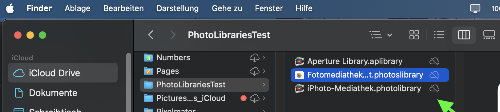 d. Position both Finder windows so that you can see the Photos Library file you found in step 1 and the Pictures folder of both on your screen at the same time. Resize them if necessary.