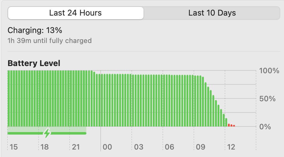 During the day I normally work with power plugged in and then close lid at night and remove power. Opening lid in morning would still have had loads of battery power left.