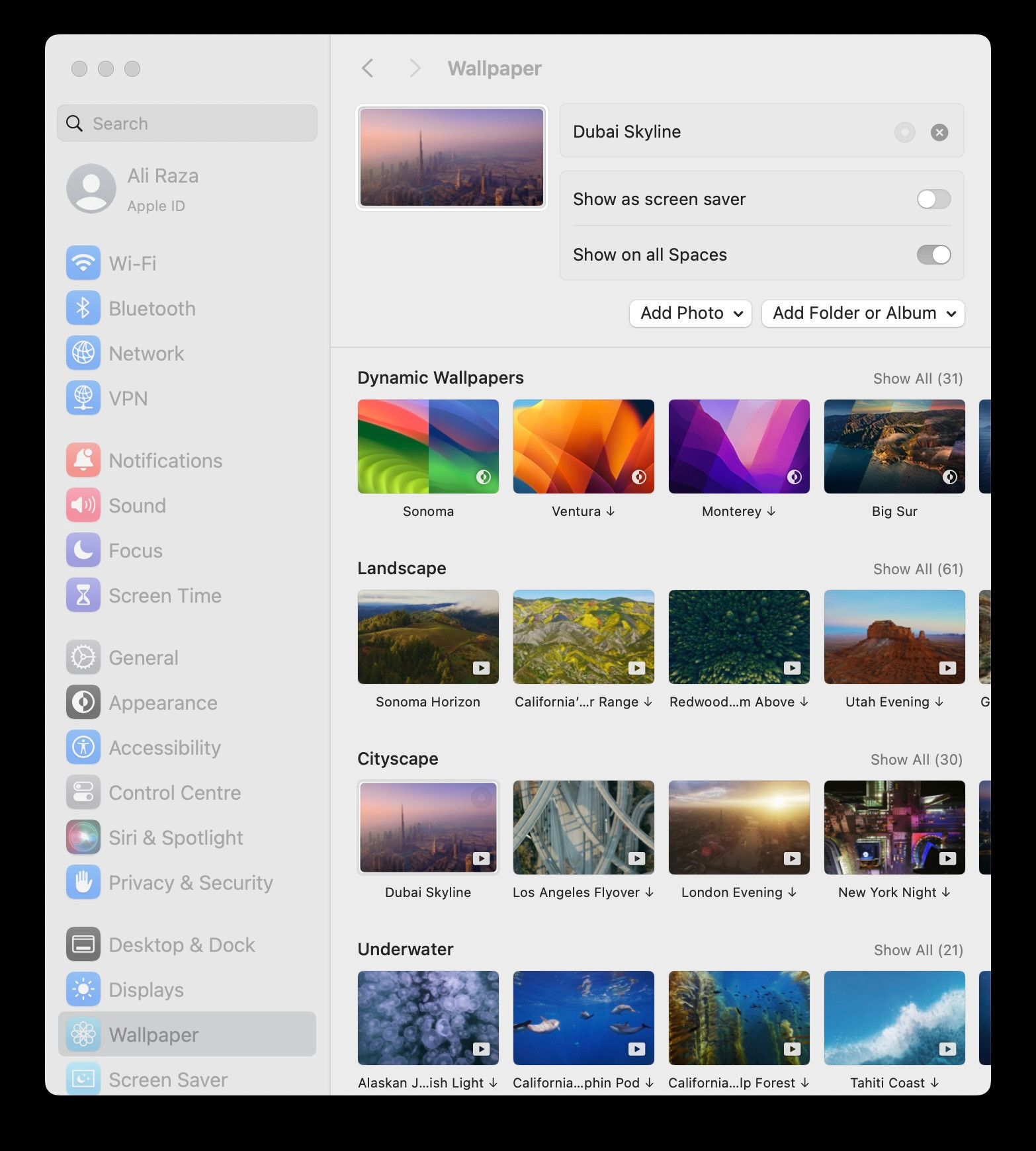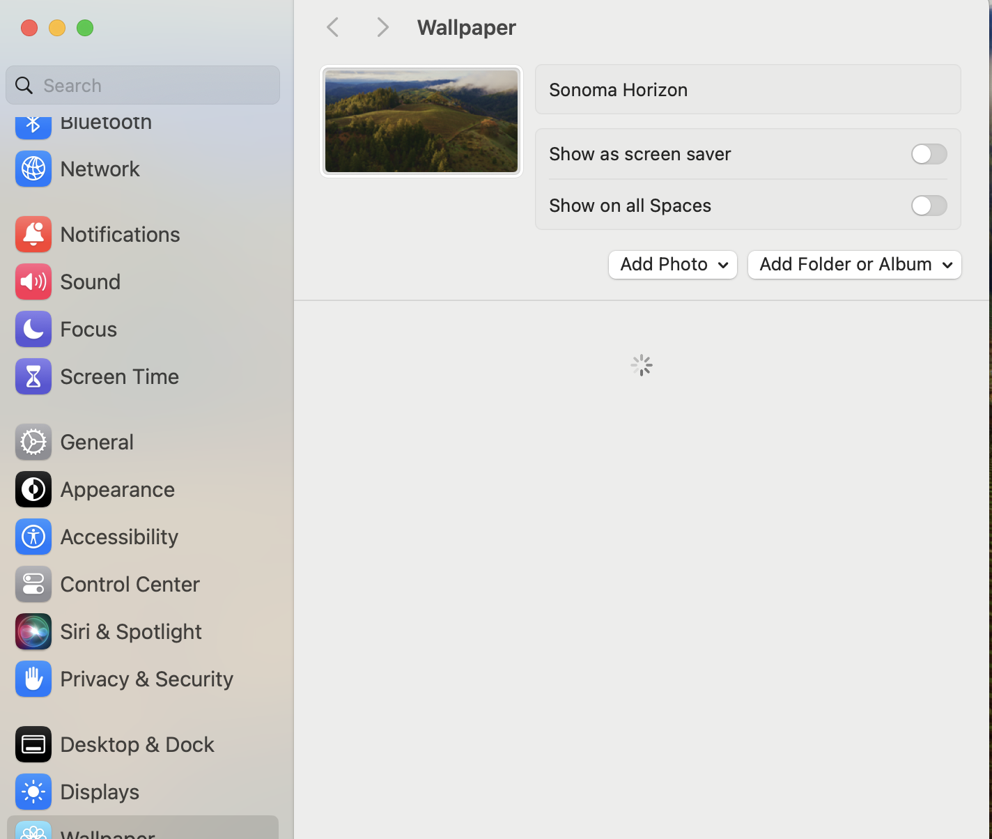 I updated my 2021 iMac to Sonoma. When going to the wallpaper settings, the only option to select for wallpaper is the Sonoma Horizon wallpaper. The system does not show any other options. It appears to be trying to download others but the download symbol keeps spinning without downloading. Any solutions? A reboot did not work. See screenshot below...