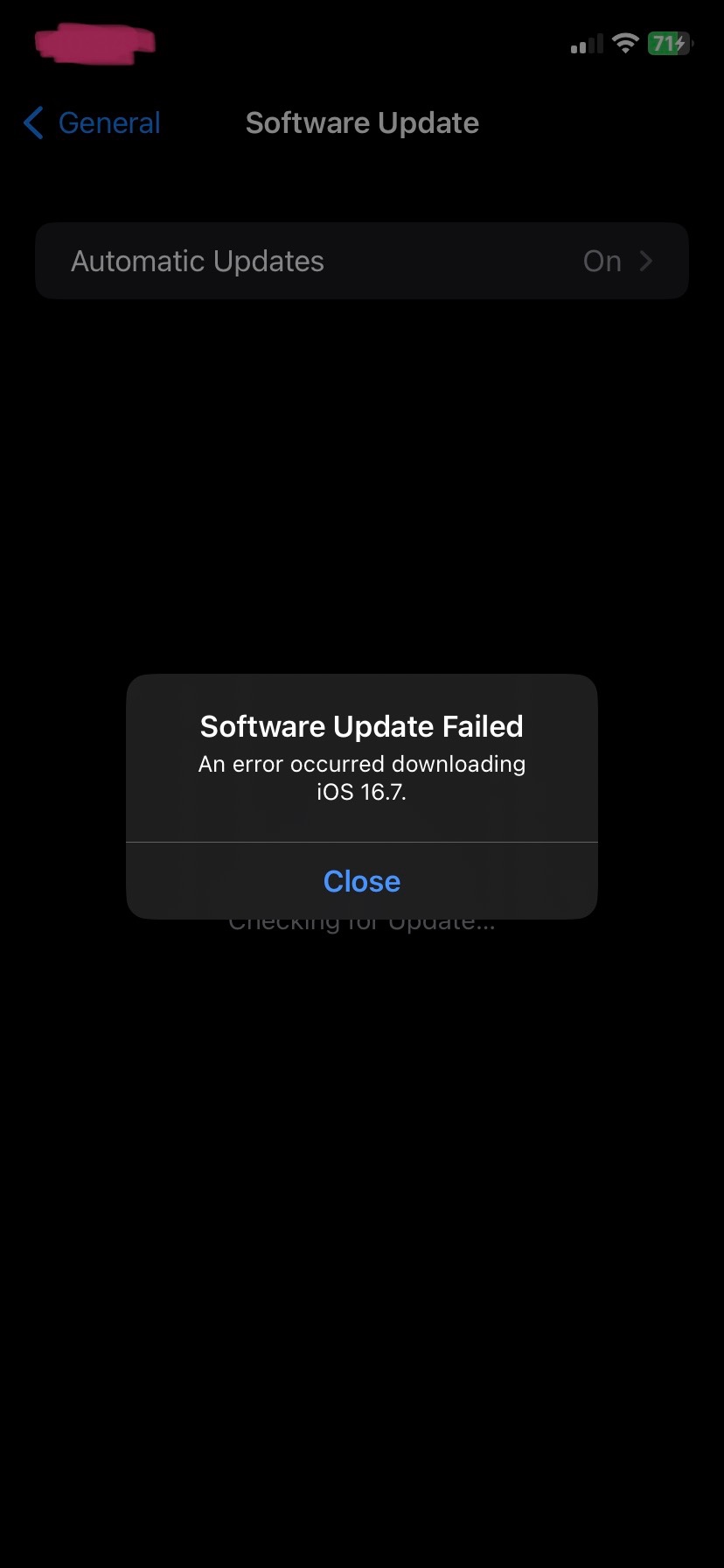 "Why does an error occur every time I try to update my phone? What would the error be?: A thing pops up every time I try to update to the iOS 16.7 that says an error has occurred"