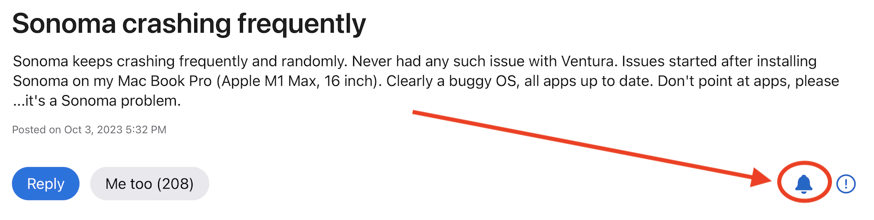 Sonoma keeps crashing frequently and randomly. Never had any such issue with Ventura. Issues started after installing Sonoma on my Mac Book Pro (Apple M1 Max, 16 inch). Clearly a buggy OS, all apps up to date. Don't point at apps, please ...it's a Sonoma problem.