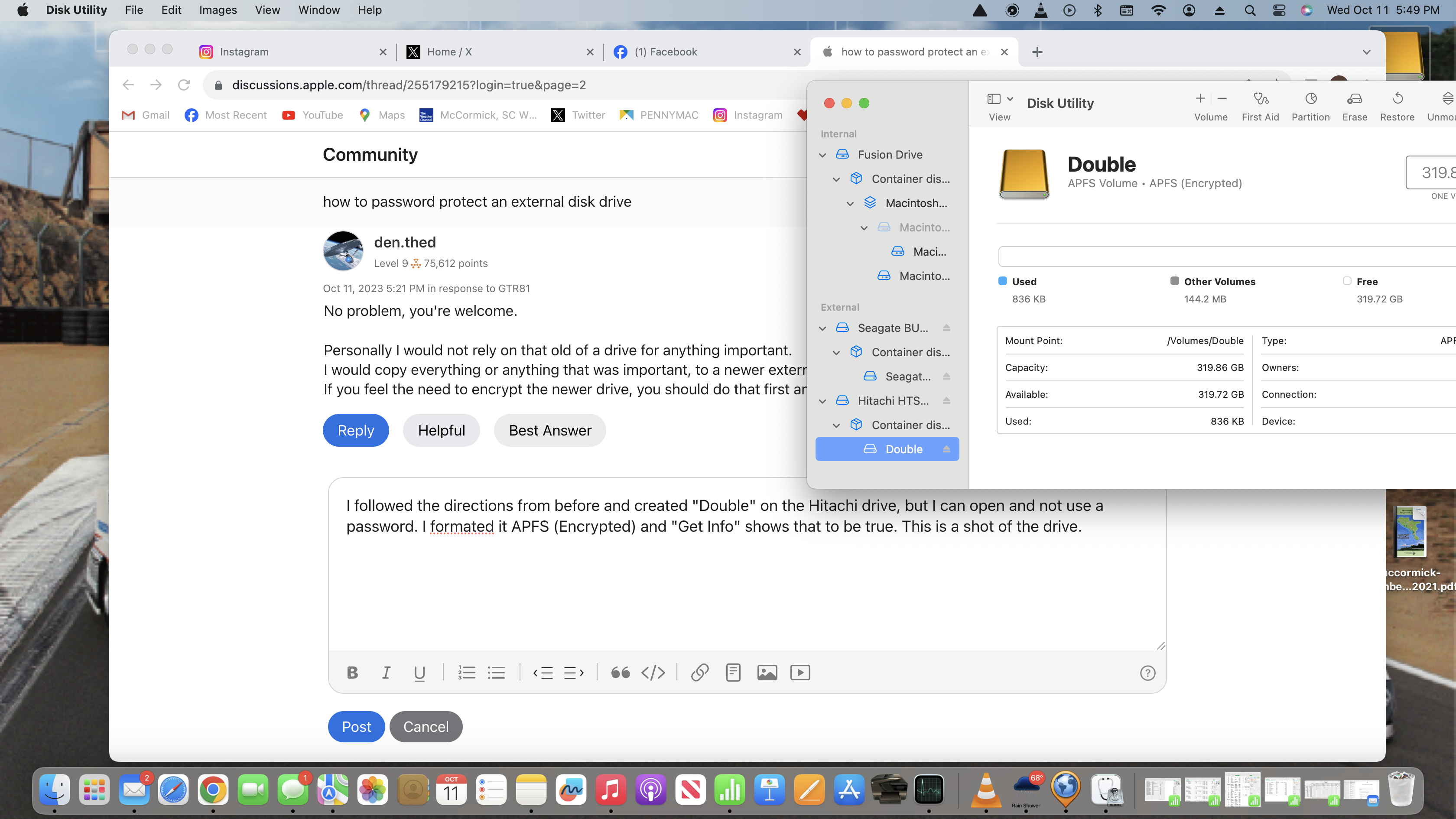 I followed the directions from before and created "Double" on the Hitachi drive, but I can open and not use a password. I formated it APFS (Encrypted) and "Get Info" shows that to be true. This is a shot of the drive.