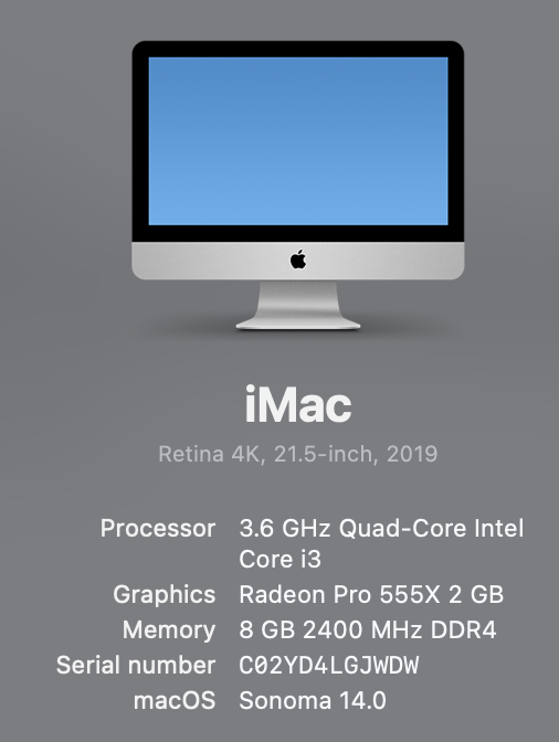My Mac has 8 GB 2667 MHz DDR4 RAM and has 3.7 GHz 6-Core Intel Core i5 processor and 839.27 GB HDD space is available of 2.12 TB total storage capacity.