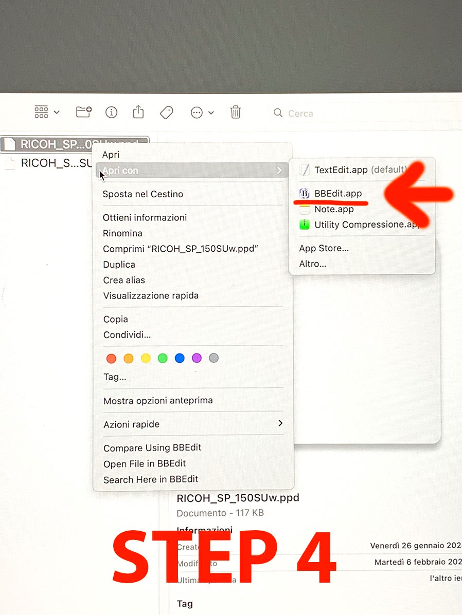 Clicca con il tasto destro del mouse su “RICOH_SP_150SUw.ppd” e dagli il comando “apri con” BBEdit