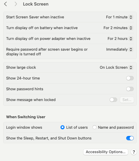 My compromise is to set: "Start screen Saver when inactive" to 1 minute; set "turn display off on power adapter when inactive" to 2 hours; set "require password after screen saver begins or display is turned off" to immediately; enable "prevent automatic sleeping on power adapter when the display is off" (not sure why this one is not preventing sleeping already?!).
