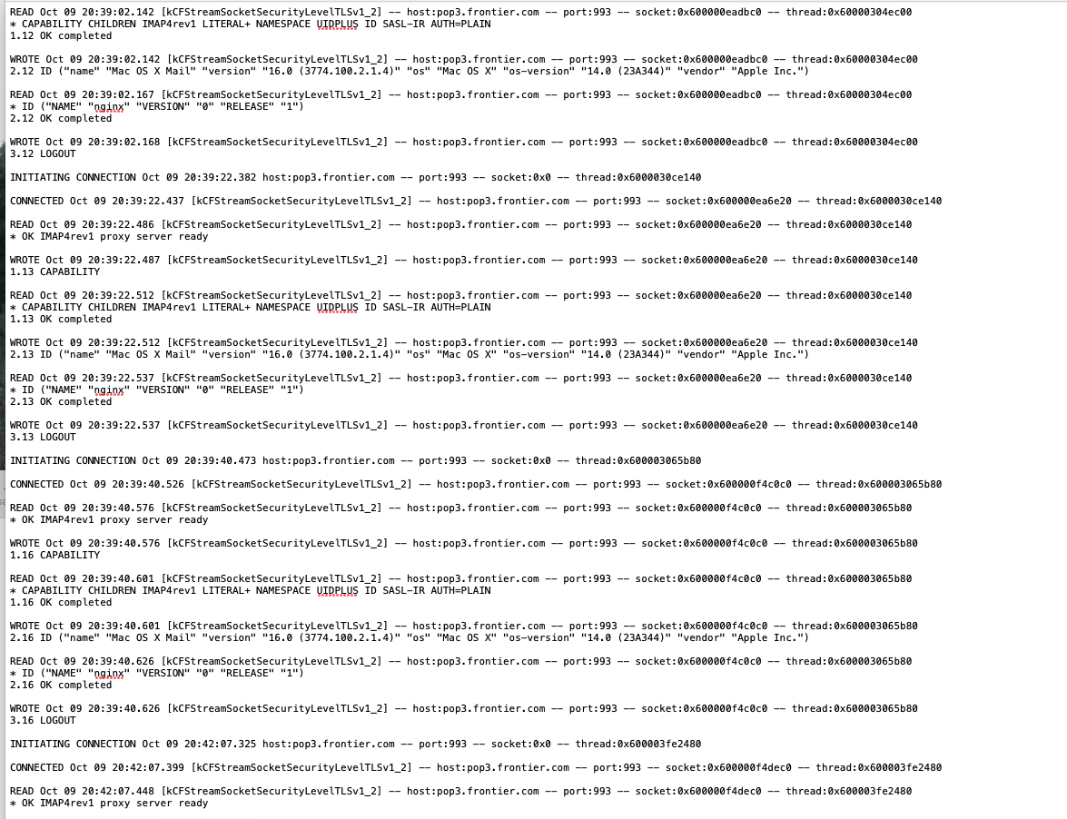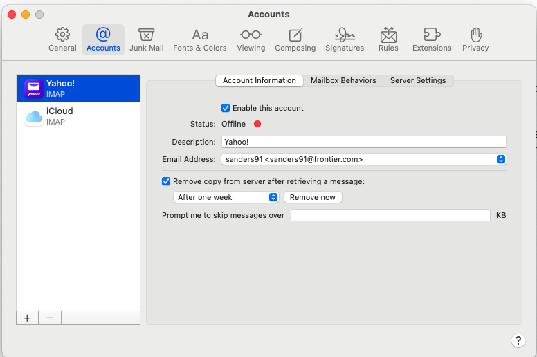 So now that we agree Frontier is using yahoo (but not yahoo.com), You should again remove this Yahoo account. Then add a new account and choose Other Mail Account. Put your credentials in and test. Then check the server settings again and it should offer you a way to set up all the settings per this: