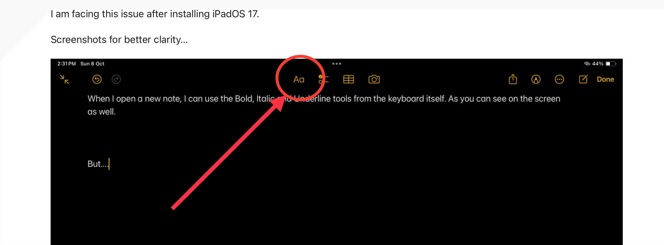 When I open a new note, I can use the Bold, Italic and Underline tools from the keyboard itself. But, as soon as I close the keyboard and open it again, the options just vanish.