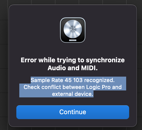 I've checked that the project in Logic run at the same sample rate as the soundcard. The inputs work fine and and there's no problem recording. In Focusrite Control everything looks okej too. What could it be that trigger the system to alert? The recording continues until I stop even after the message apperas. But the result is a recording the cracks and pops, even making short "time jumps" thats renders it useless even though the sound quality itself is good.