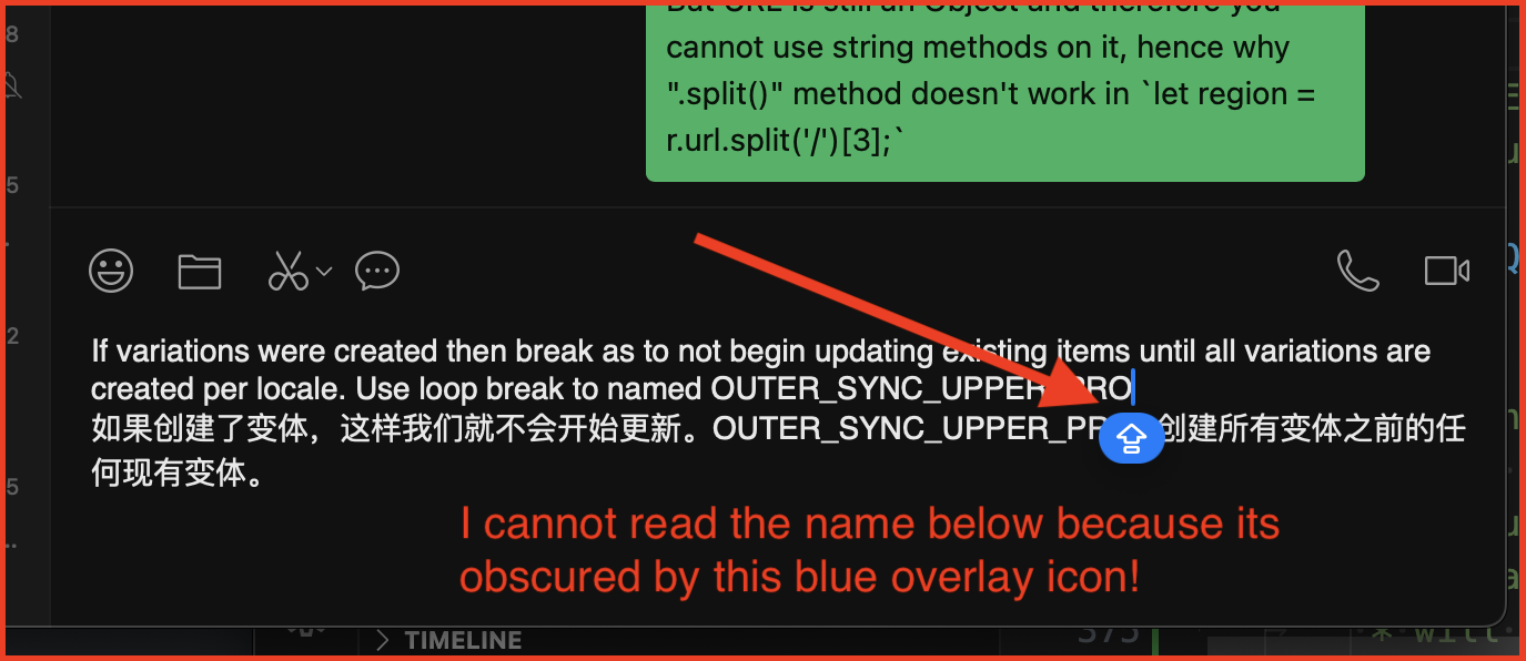 Below are some screenshot example of when this is covering the text I'm trying to read and I hope this can illustrate how it is very frustrating to work with this pointless overlay.