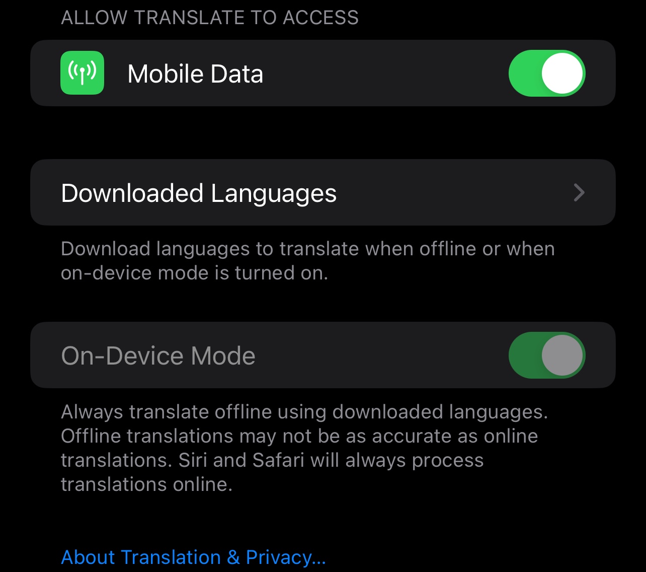 Please help! My Apple translate app seems the be stuck on “on device mode” it’s greyed out and I can’t turn it off. Why would this be? What setting have I missed? This is on both my iPhone and iPad. Many thanks