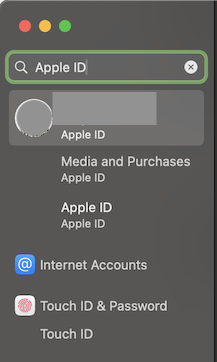 What do you see if you type in appleid in the search bar of System Settings at the very top?