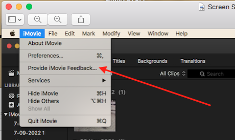 Open iMovie and click on " iMovie " at top of screen and select > Provide iMovie Feedback.