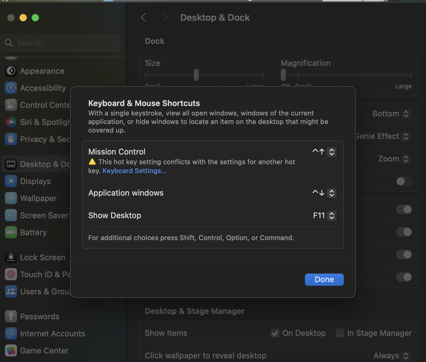 Okay so in System Settings > Dock and Desktop > Shortcut Buttons, I see the below which states Mission Control setting conflicts with another setting in Keyboard Settings. When I click on Keyboard Settings, both Mission Control settings are set to the same thing (control + up arrow), none of which is the 'left shift' key.