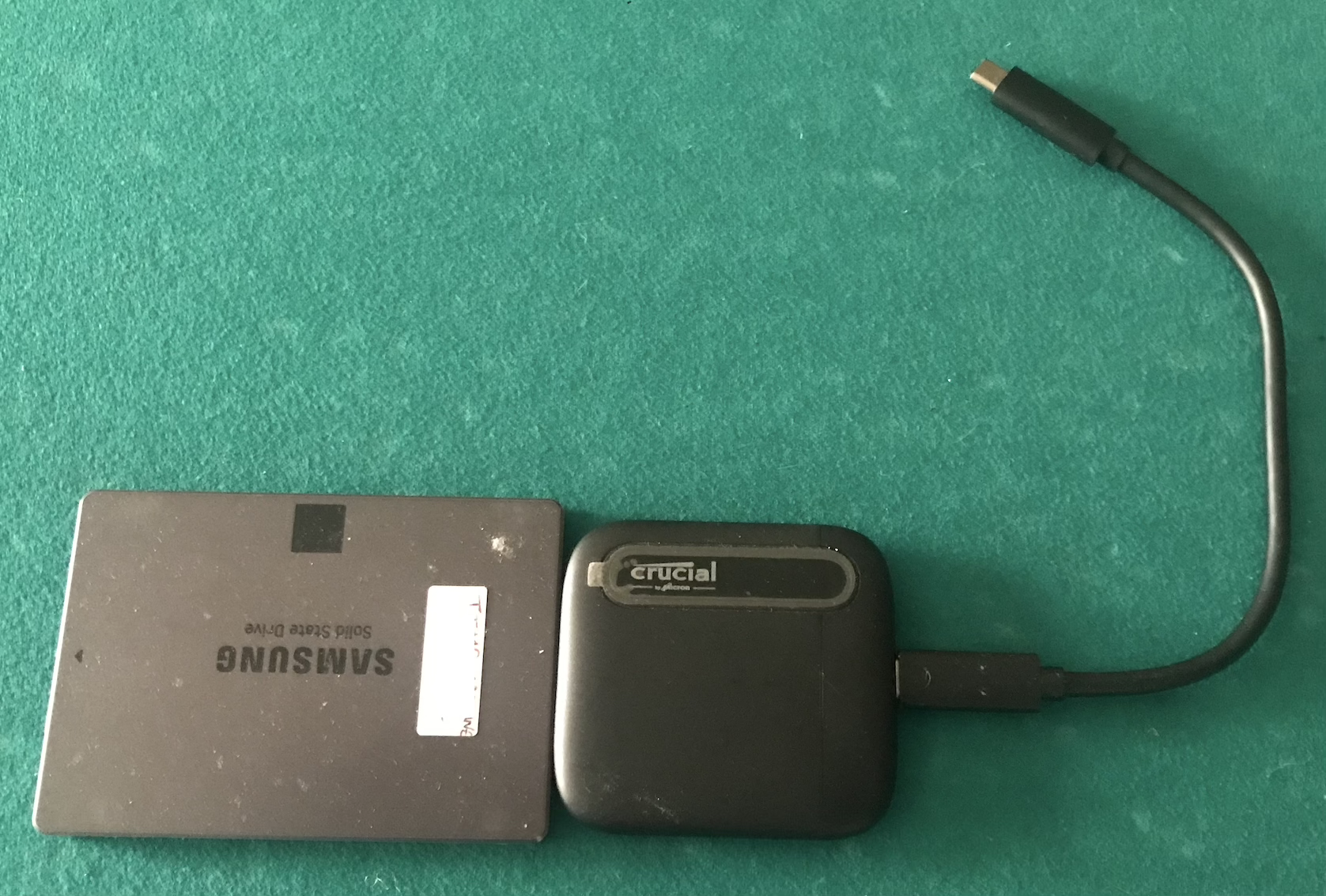 In the picture, the Samsung is a bare SATA SSD (that is, just the drive; to mount it externally you'd need to put into a case), and the Crucial X6 is an NVME SSD. I am sure that they can be smaller yet.