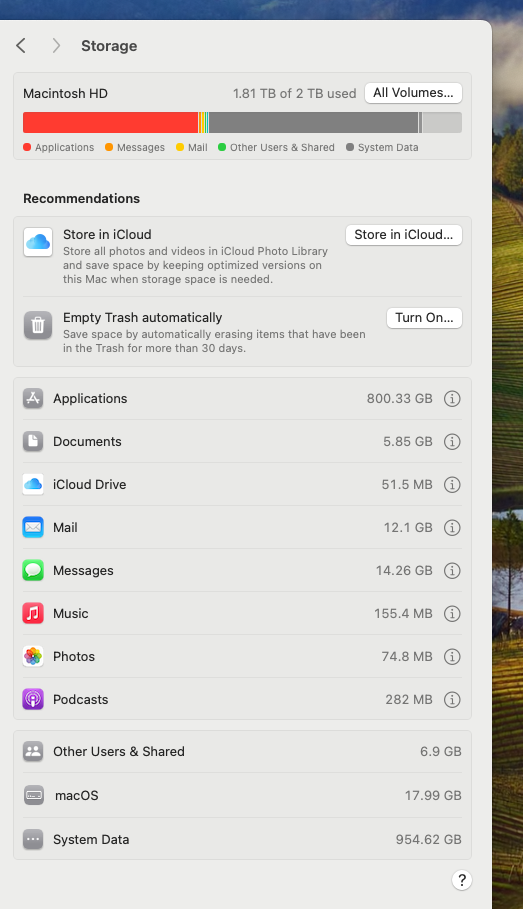 Something is not working fine; when I first turn on the computer, System Data shows 1,6TB of usage and Applications 36GB. After a few seconds, System Data goes to 950GB and Applications goes to 802 GB. I don't have 800 GB of applications. Just 36 GB.