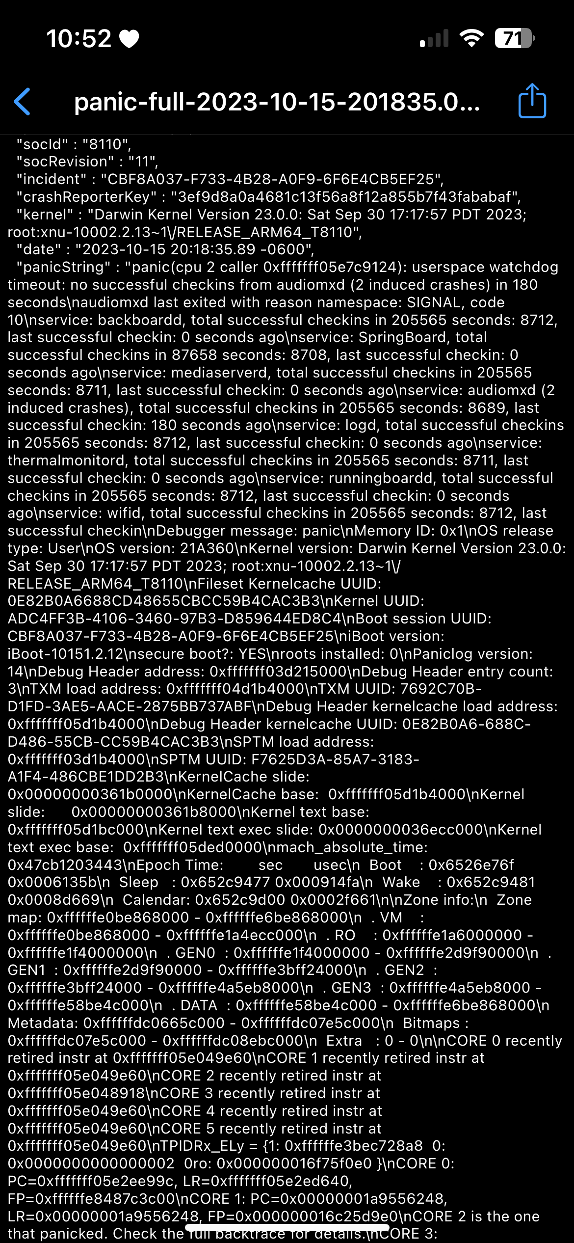 "Iphone 14 sudden shut down?: my iphone randomly shut down so i talked to apple support and they suggested a force restart, which i did. however, i went to the panic string and found this? what does this mean and should i be concerned?"