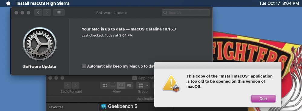This is hard to explain, but some of you may have a LARGER problem, that's giving you the High Sierra full installer download errors. I'll detail what the larger problem is, and how you can spot it below. If you check and think you have the Larger problem, I'd highly recommend you go ahead and fix it, as it will keep causing "server" and "connection" errors until you do. There are more potential errors than just the examples I give below. Fixing the Larger problem requires a clean install of High Sierra, from the installer you already want to download, and might have been planning to clean install anyway.