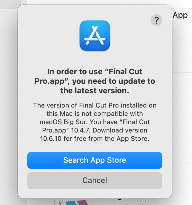 I am offered a similar prompt to the screen shot that dnyhagen posted below, when I click "update". Aka, it asks if I wish to update to a previous version compatible with my BigSur MacBook. If I select "download" previous version, nothing happens and the prompt remains. I have tried this several times, updated to the latest bigsur and nothing changes. I am interpreting the advice on this thread to be that I should delete FC, and then select a new download. I am hesitant to do this as I fear apple will simply have a bug and I will never be able to have FC again without buying a new MacBook. Has anyone had success with the delete and download advice when they experience the same issue as me, logged in under their ID that purchased FC, etc, etc? Seems to me that the App Store update prompt should work, and if it is buggy, then how can I trust that putting my faith in it won't cause a complete loss of my purchase? Thx.
