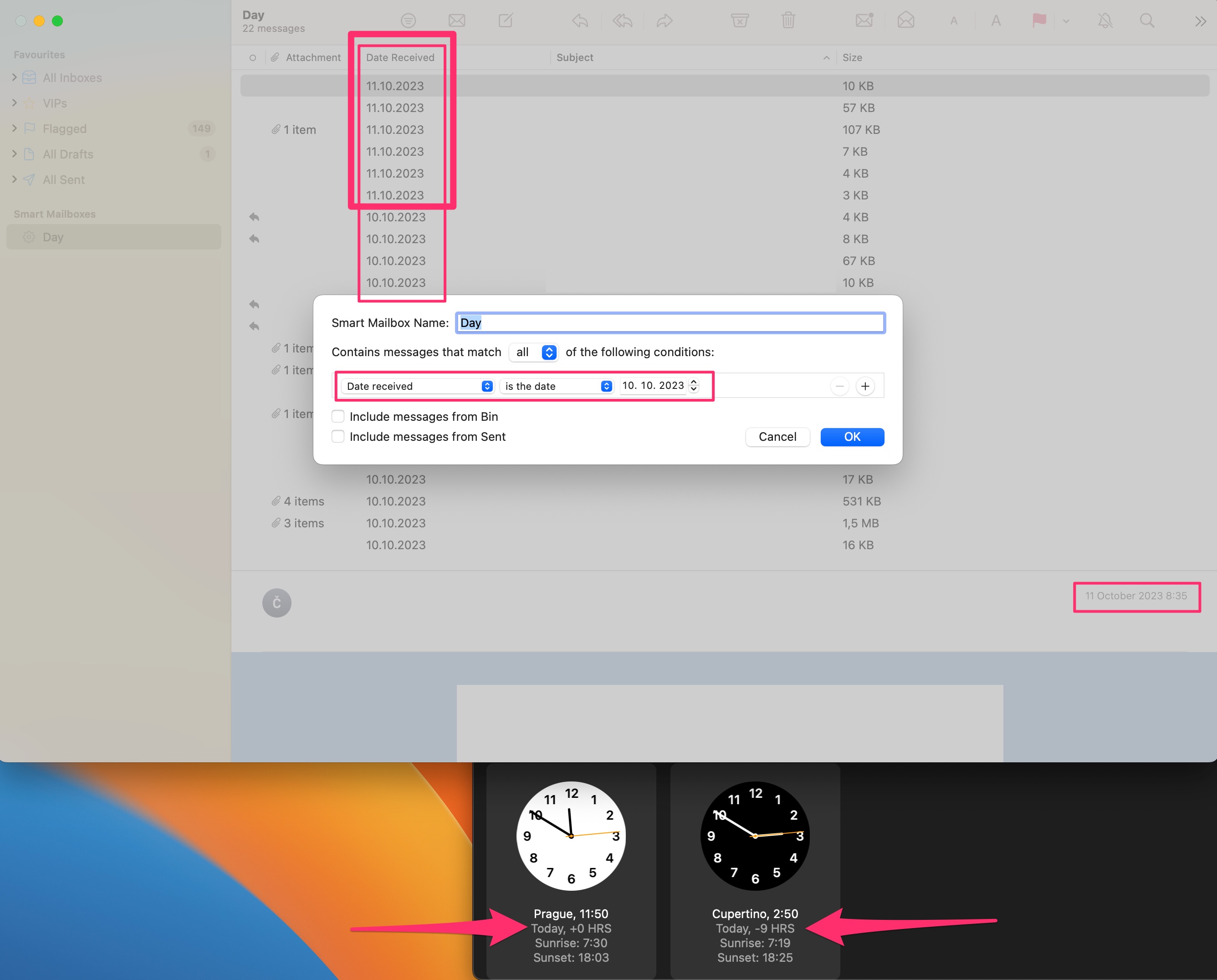 Hello. I have a problem that has been going on for a long time. I thought upgrading to a new version of Sonoma OS would fix it, but it didn't. Smart Mailboxes in Mail are not working properly for me. I noticed this with the time item. For example, when searching by date, this also includes part of the items with the following date (always items before 9 am). I am based in Central Europe (Prague) and it seems that the search is not guided by the system date and time, but by the californian time (time is -9 hours). Don't know what to do with it? (I have attached a preview).