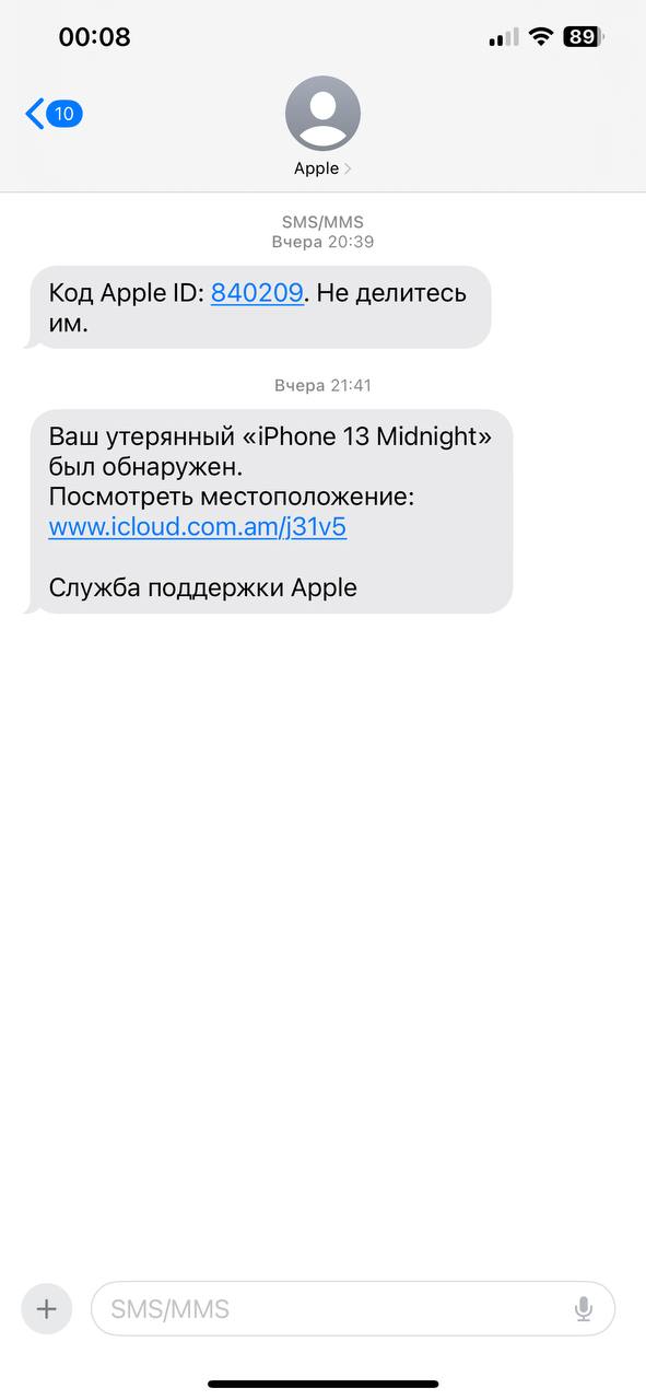 I couldn't sign in to my Apple ID because of two-factor authentication, and my phone was stolen along with my SIM card. Today I received a SIM card with the old number, signed in to my Apple ID from another device. An hour after logging in, I received an official message that the phone was found: