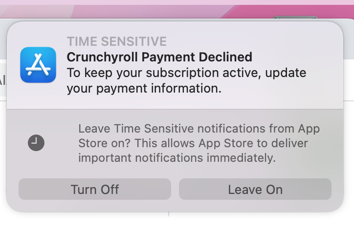 I got this notification pop up on my mac screen last night......Ive never downloaded an app or even looked at a website called 'crunchyroll' dont know how it could have my payment details?......silly me clicked on 'leave on'...anybody else got these and do I have a virus/malware now? Cheers !