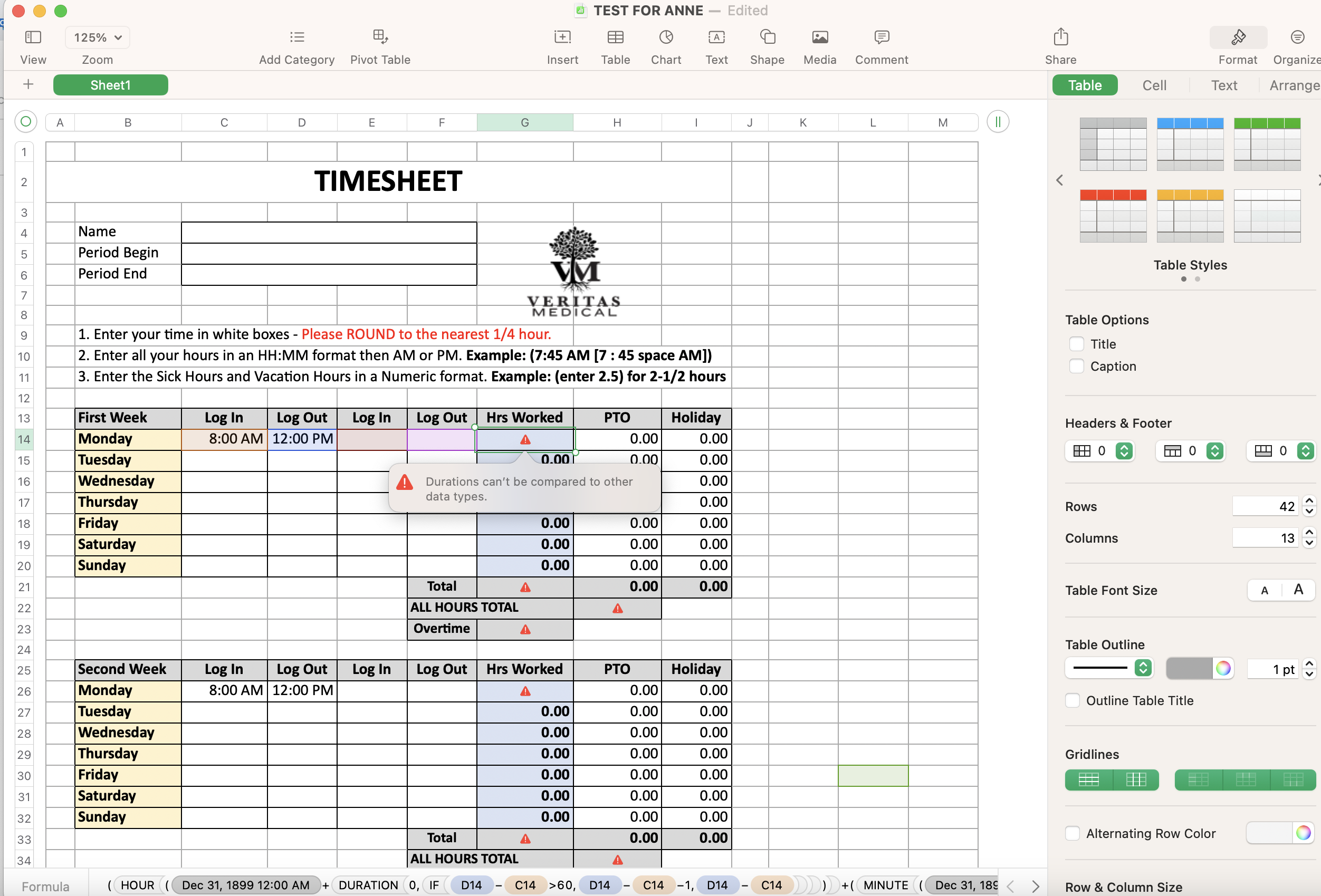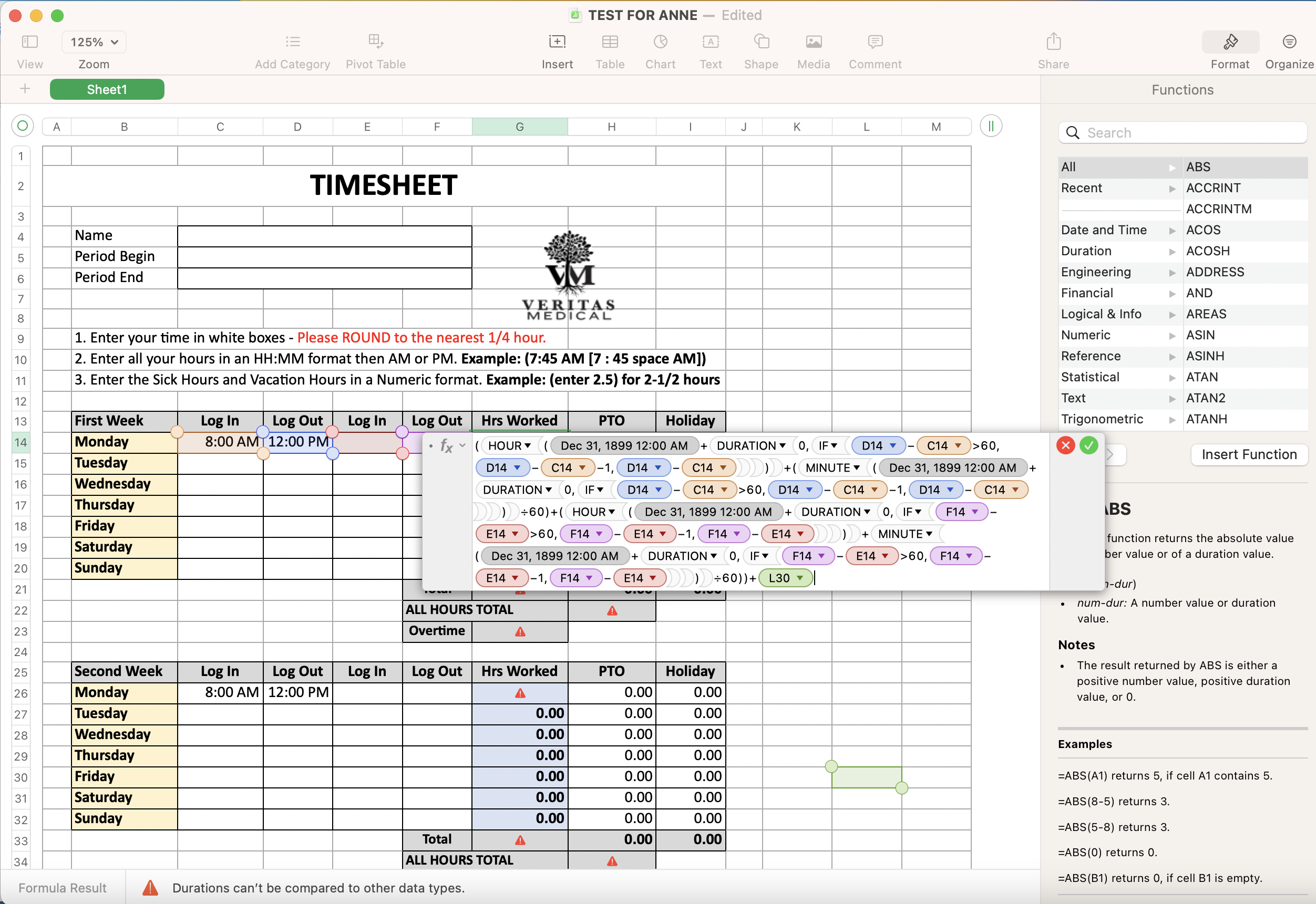 I need help working on this formula. I transferred this information from an excel spread sheet. My formulas will not work in number. I have attached a screen of the error message about duration. I have attached a second screen shot with the formula that will not work. Can someone help fix this error.