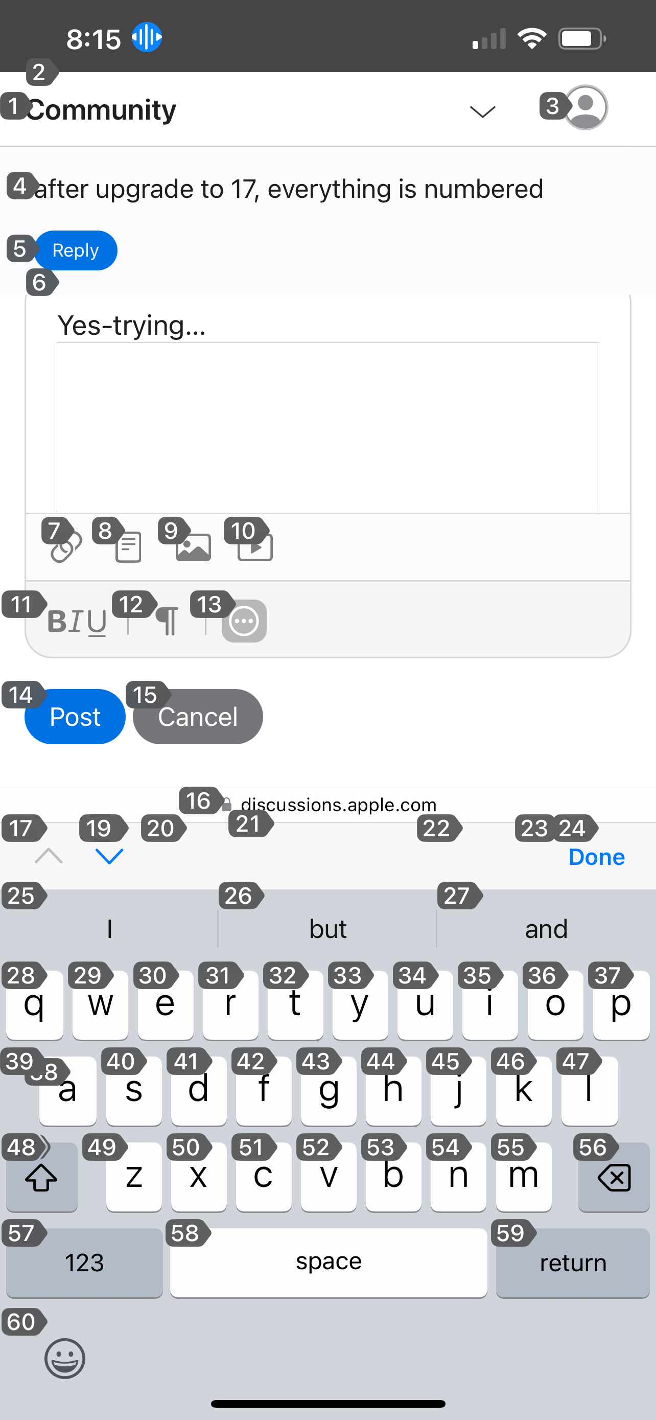 every thing on my phone has a number with it, the whole keyboard..everything is numbered and I cannot figure out how to get rid of those numbers. This occurred after upgrade to 17