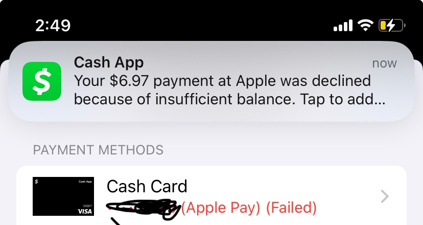 Example: was trying to buy a 0.99 product online but it wouldnāt let me saying it was 6.97 WHEN IT clearly wasnāt. Now, I had enough for 0.99 cause I had 2.00 in my bank acc. Iāve contacted cash app but nothing makes sense so now Iām stuck... Also my cash app card says āfailedā and Iāve tried updating my information but everything is up