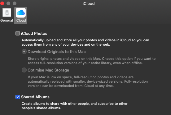Important: If you switch to another library, Photos automatically turns off iCloud Photos and Shared Albums. You can turn them on again in the iCloud pane of Photos preferences. When you turn on iCloud Photos after designating a new System Photo Library, the photos stored in iCloud are merged with those in the new System Photo Library. After the content from the new System Photo Library is uploaded to iCloud, the libraries cannot be unmerged, so consider carefully before changing your System Photo Library.