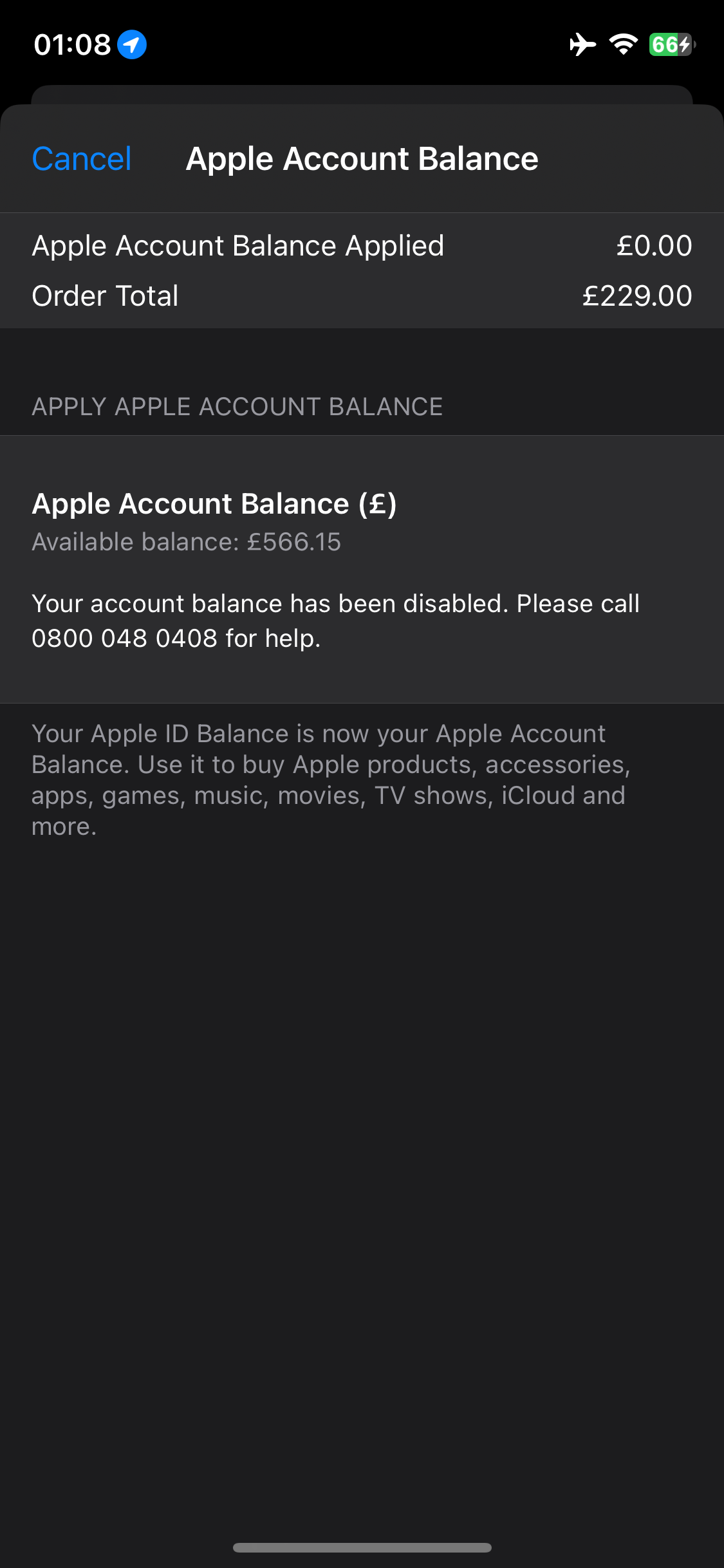 My Apple account balance has been disabled with 2000 pounds on the balance.