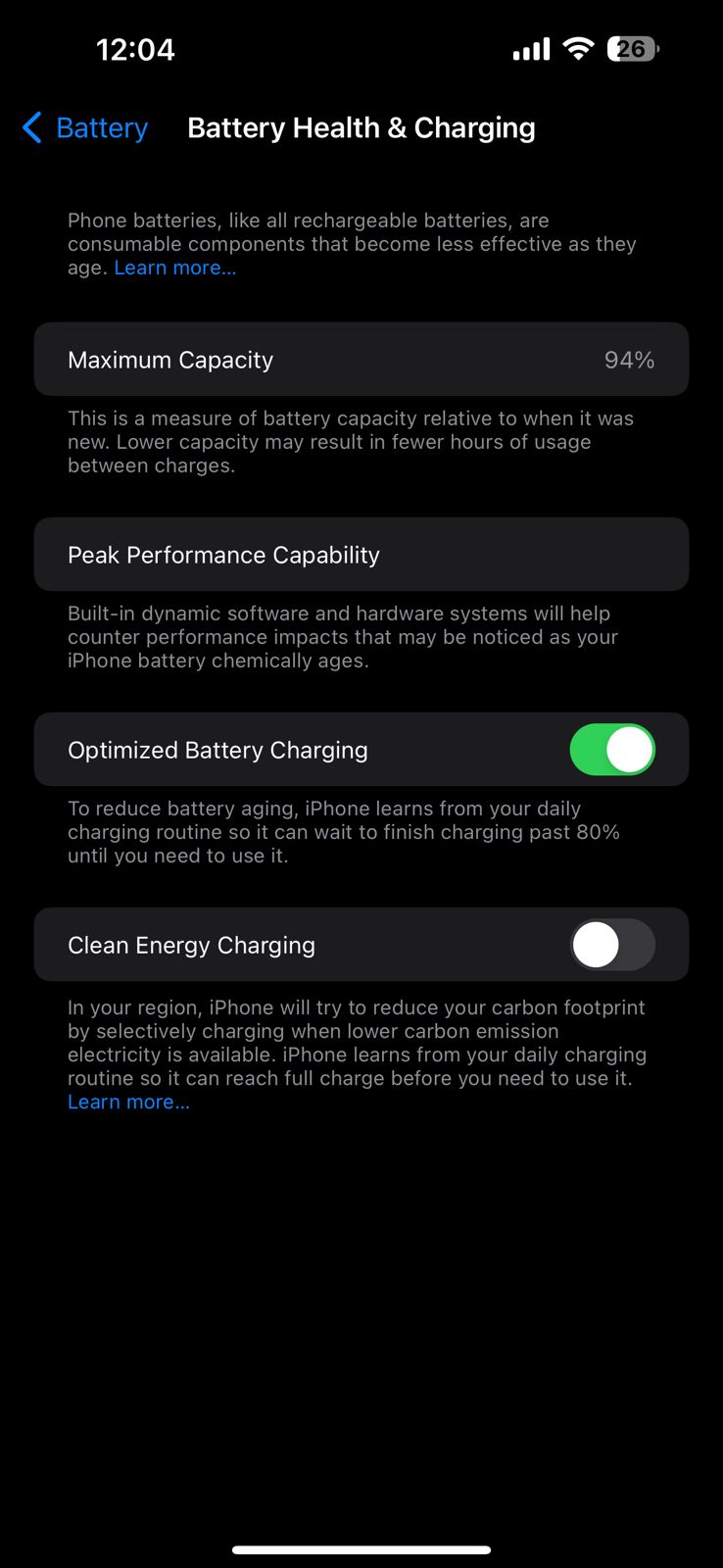 I recently activated the logs analytics and from what I can tell my maximum capacity is 97%, however if i go to settings> battery > batter health & charging. I see maximum capacity is 94%.