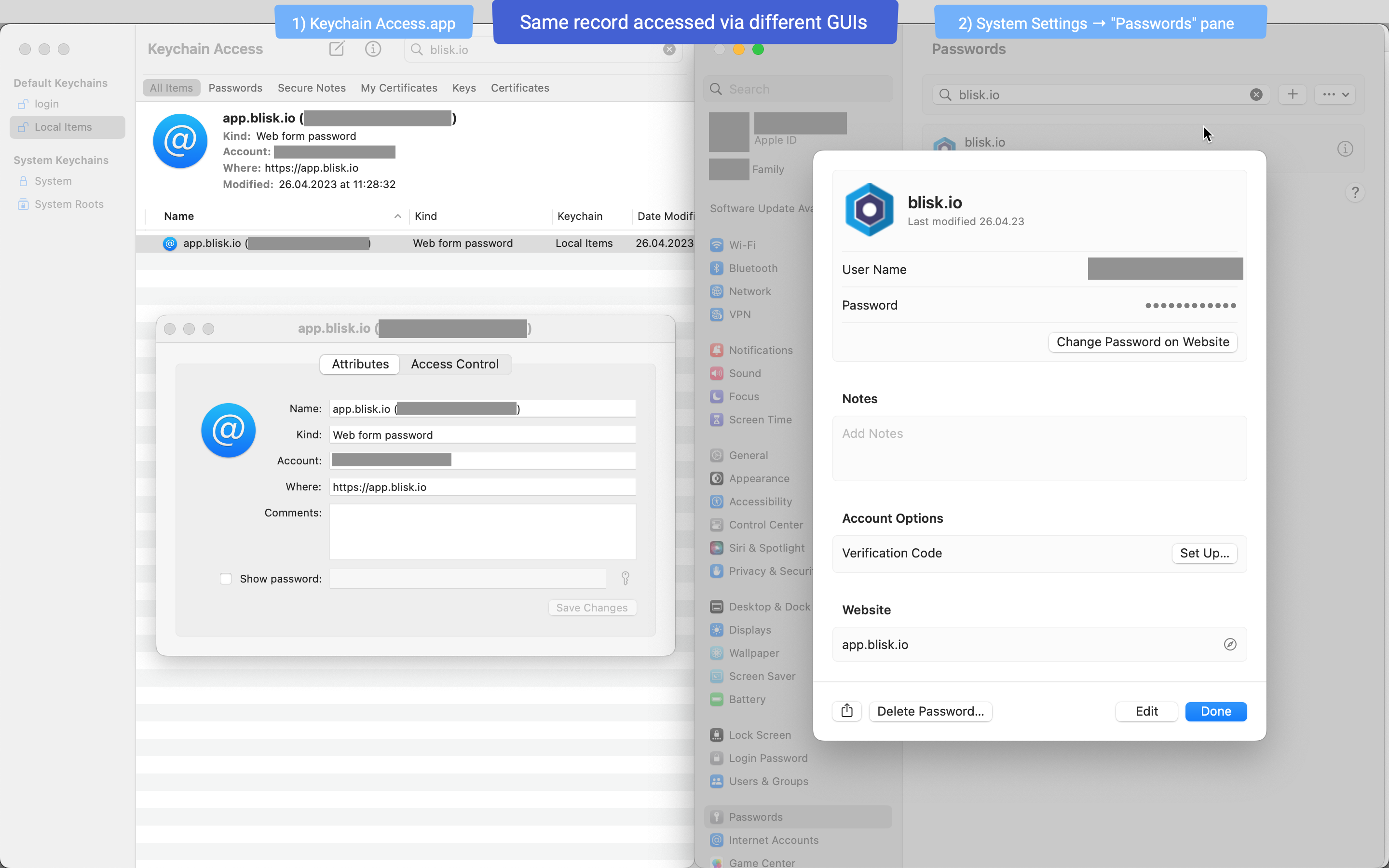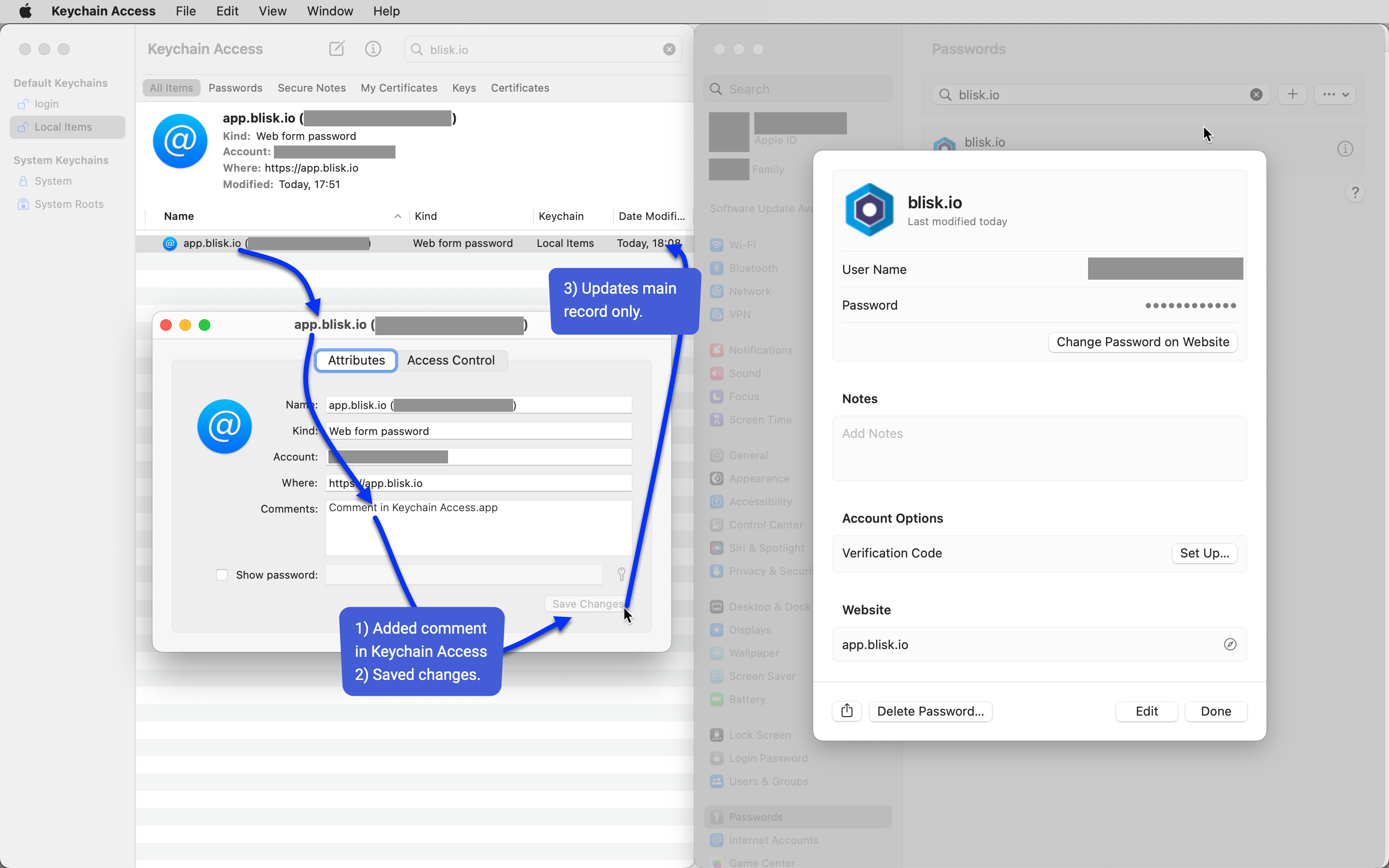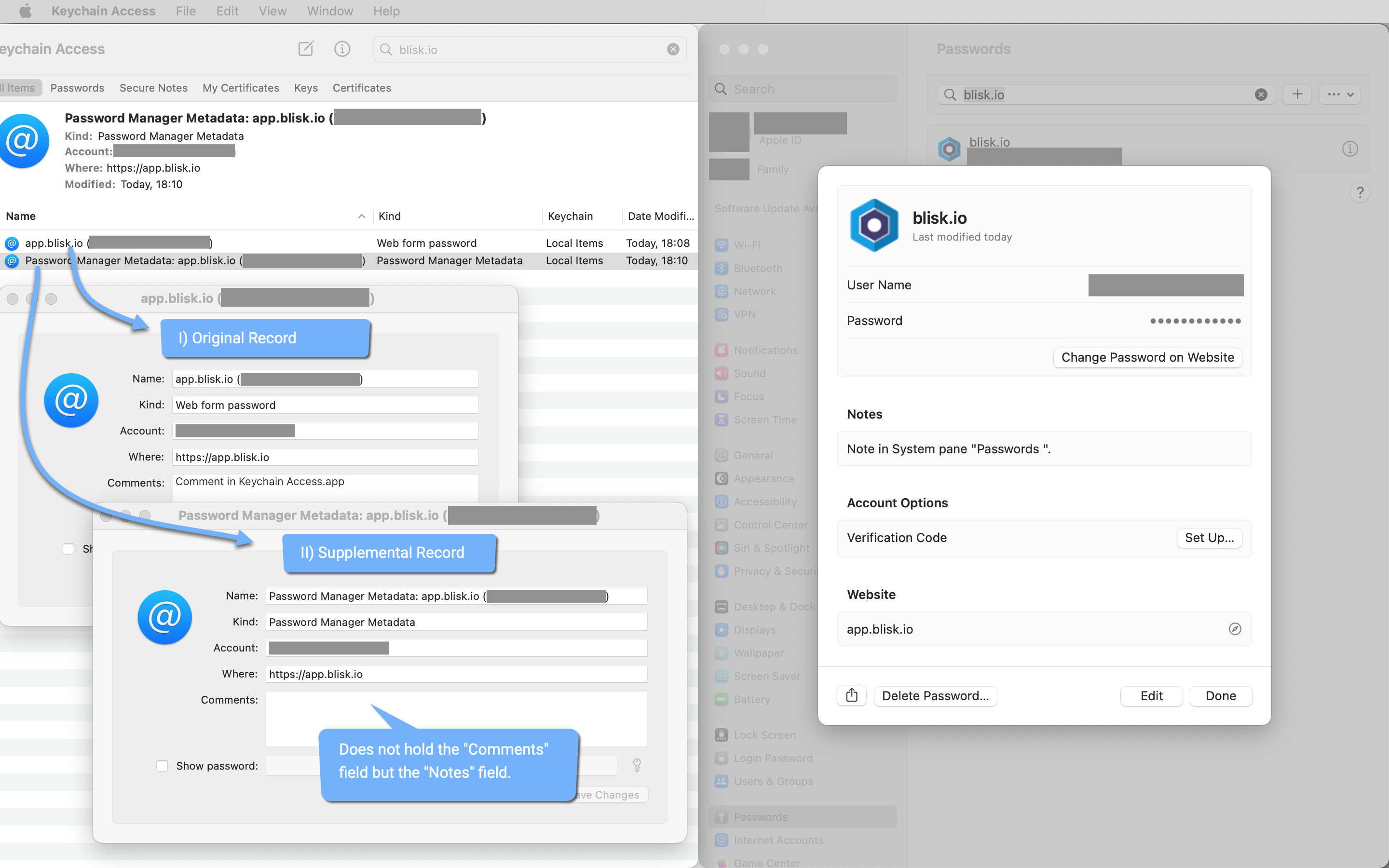 2) Another interesting observation (a sloppy/buggy implementation by Apple if you ask me): If you then later clear the "Notes" field in the "Passwords" settings pane, that supplemental metadata entry nevertheless still remains. Although it there is no more metadata. Here Apple forgot to also properly delete that supplemental metadata entry if it carries no more metadata. A lot of bogus/orphaned metadata entries (which technically just carry a Notes="" NULL entry) will accumulate over time. Really sloppy implementation!