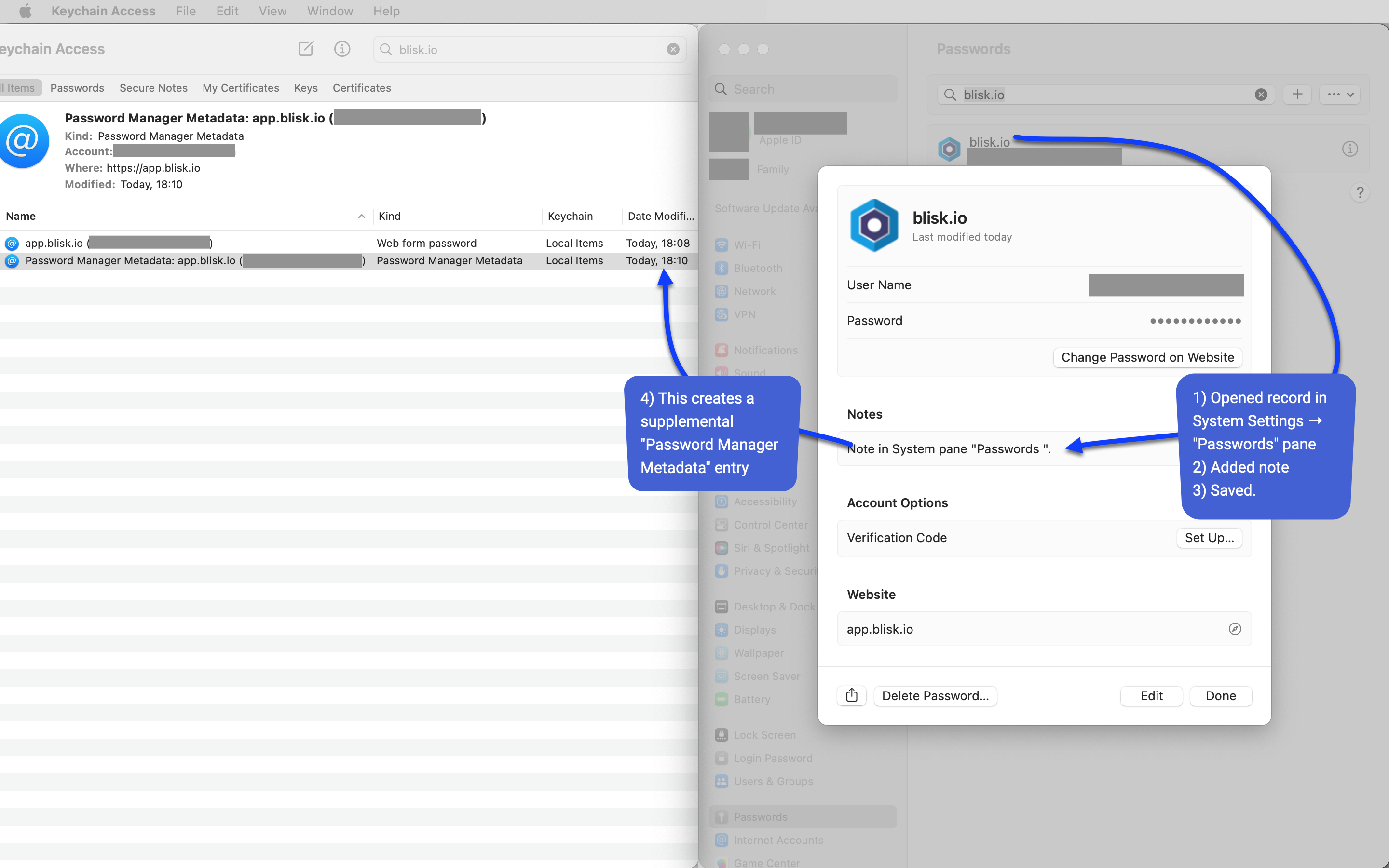 1) Could anyone please verify/falsify my explanation that for those supplemental "Password Manager Metadata: …" records that show up in Keychain Access.app, one indeed can remember having added a "Notes" field to the corresponding domain/username record in the "Passwords" settings pane?