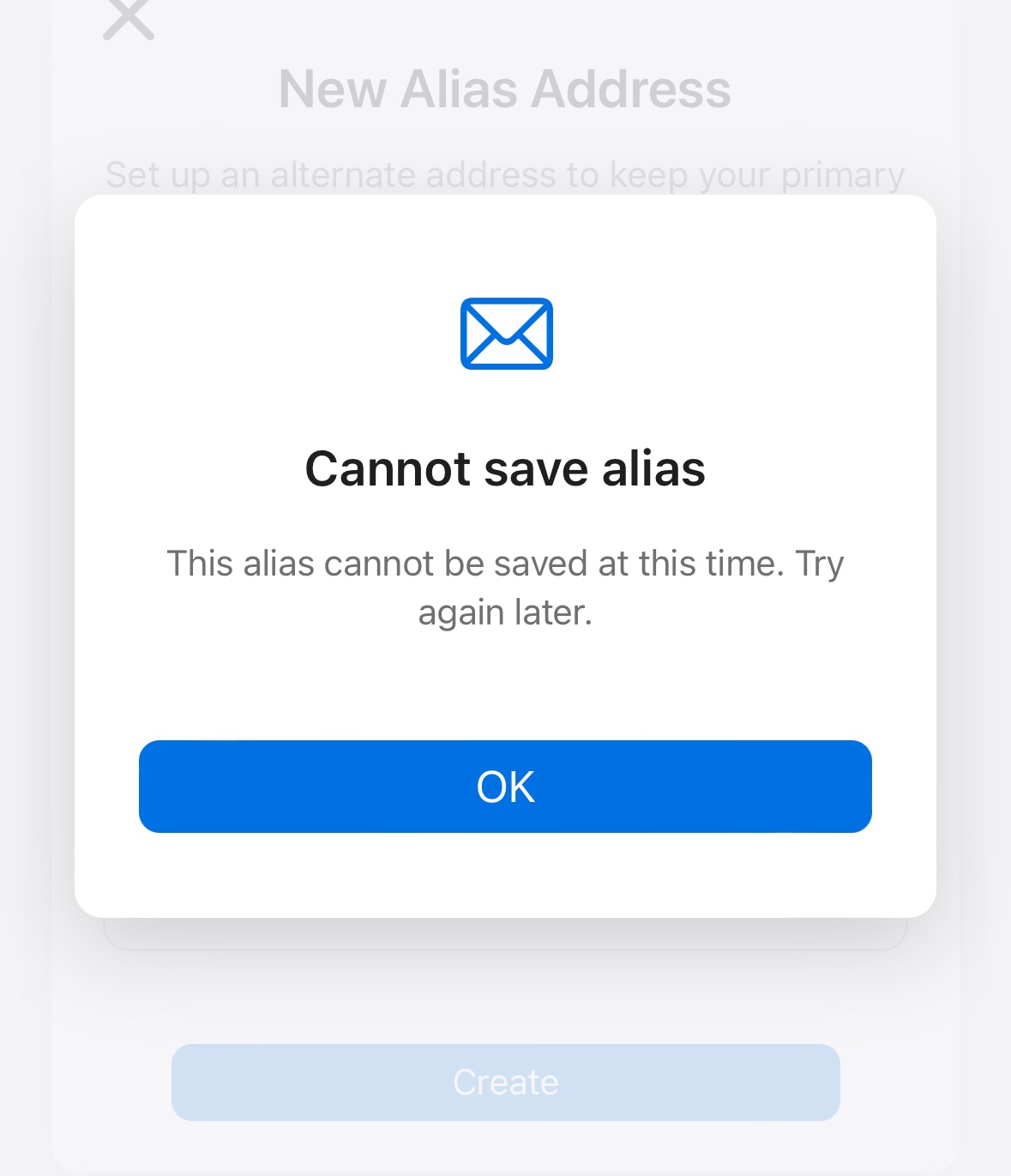 I am trying create a email alias on mobile iOS settings iCloud email (3 remaining) and on iCloud website (2 remaining) weird it says different remaining number though, anyway on iOS it says server error please try again later and on web cannot save alias.