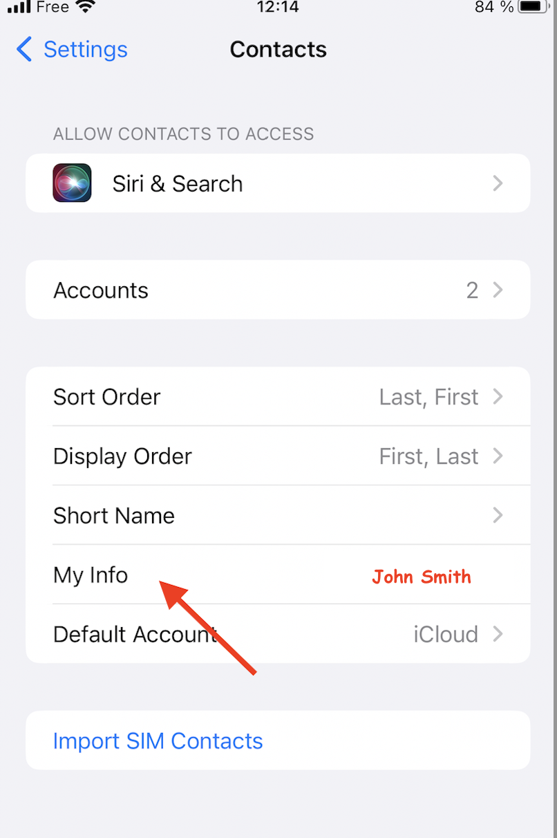 Go to Settings > Mail,Contacts and Calendar, > Contacts> my info> Tap on your name in the contacts list.