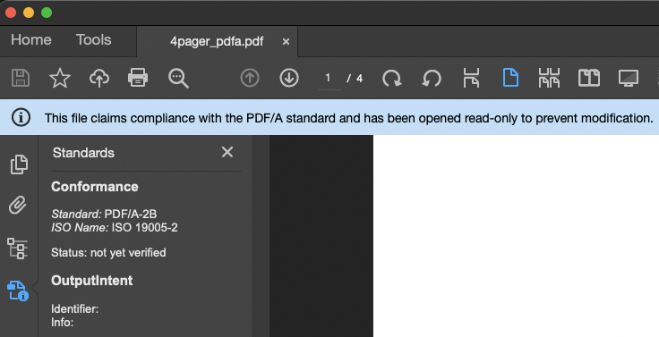 It is one thing to generate the PDF XMP data that hints that a document is a PDF/A, PDF/X or PDF/UA document, but until that document is scrutinized by appropriate verification software, it is only a suggestion of that compatibility.