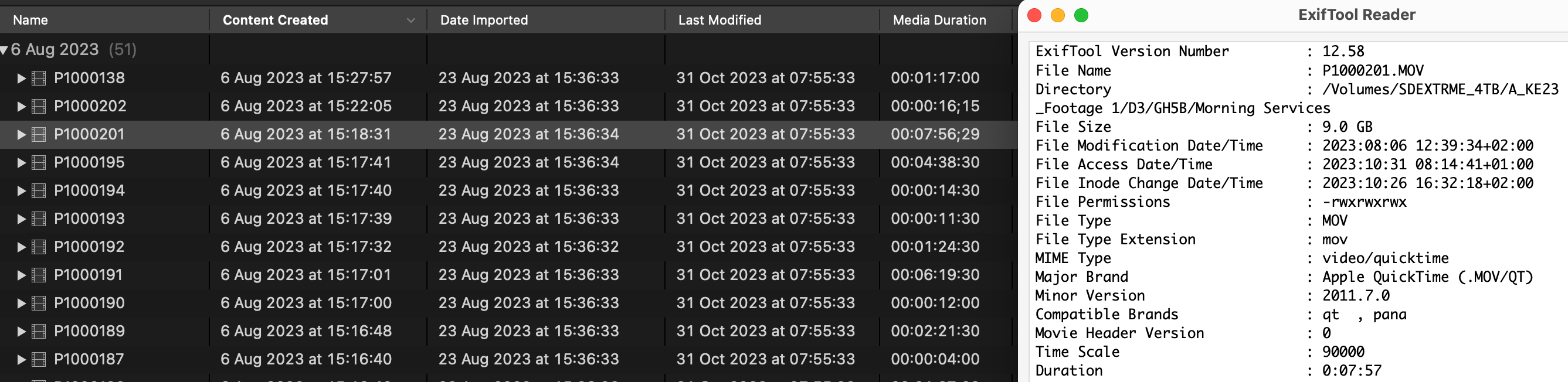 The screen shots show the actual File Creation time as shown by EXIF tool, but FCPX shows the time the file was transferred to the SSD from Cam Card