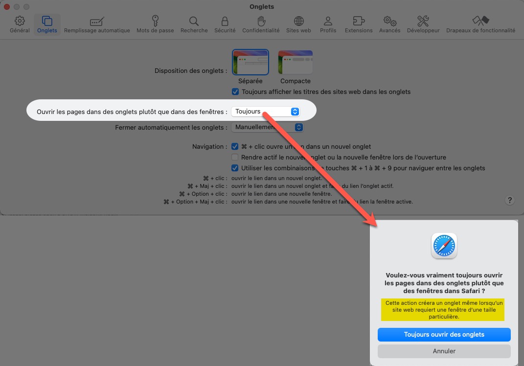 On Safari 17.1, links that require the window to be a particular size are no longer opened in a NEW TAB but in a NEW WINDOW, even if the "ALWAYS" option is activated.