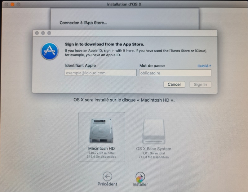 Hello, while installing Yosemite in the OS X install section(App store sing in )on the MacBook Air 2010, an unexpected error occurred while signing in.