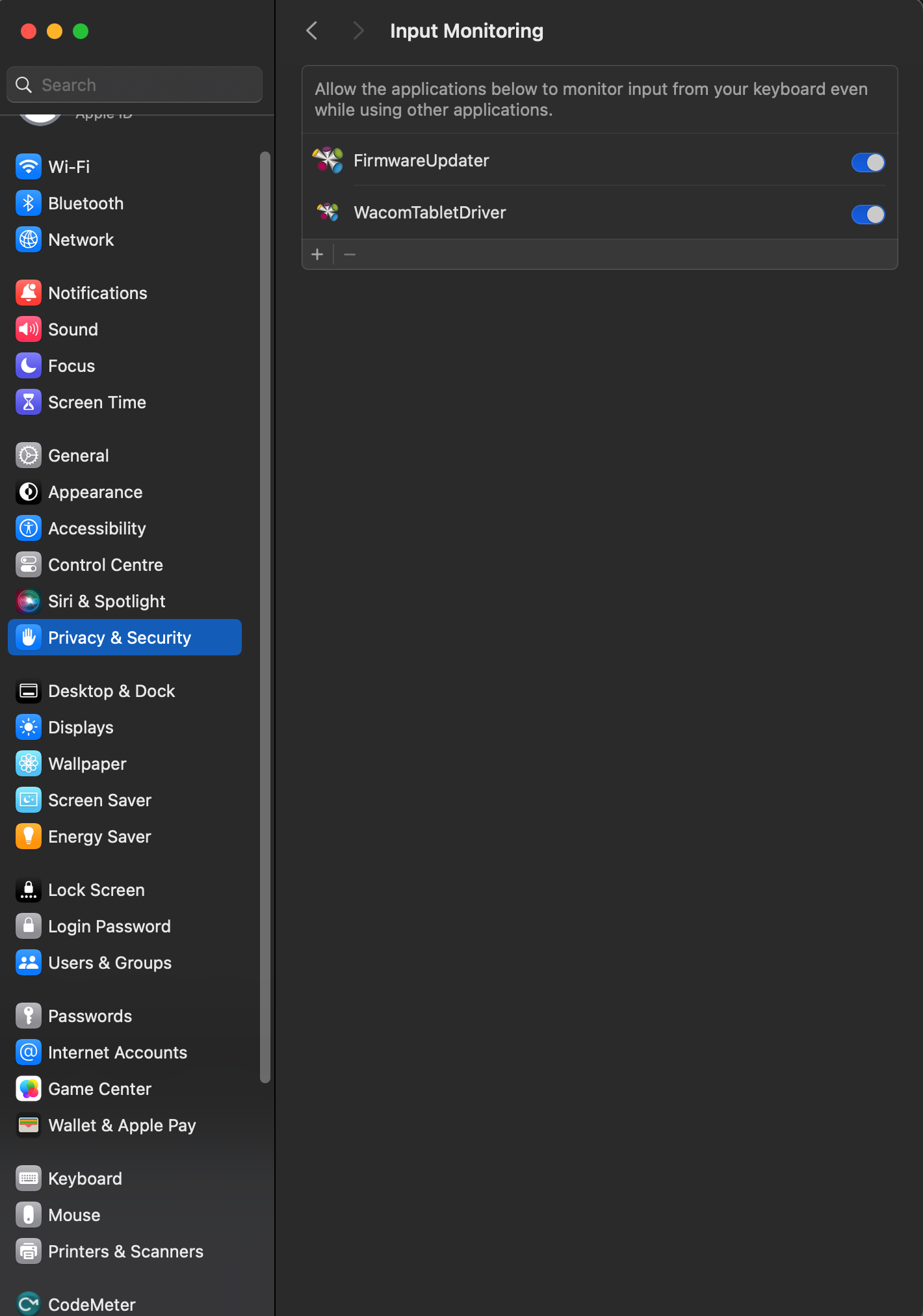 I checked Privacy & Security - Input Monitoring and Accessibility, it's all turned on. What am I doing wrong? I just want these keys to function when I'm drawing. I would appreciate any help out here. Thanks