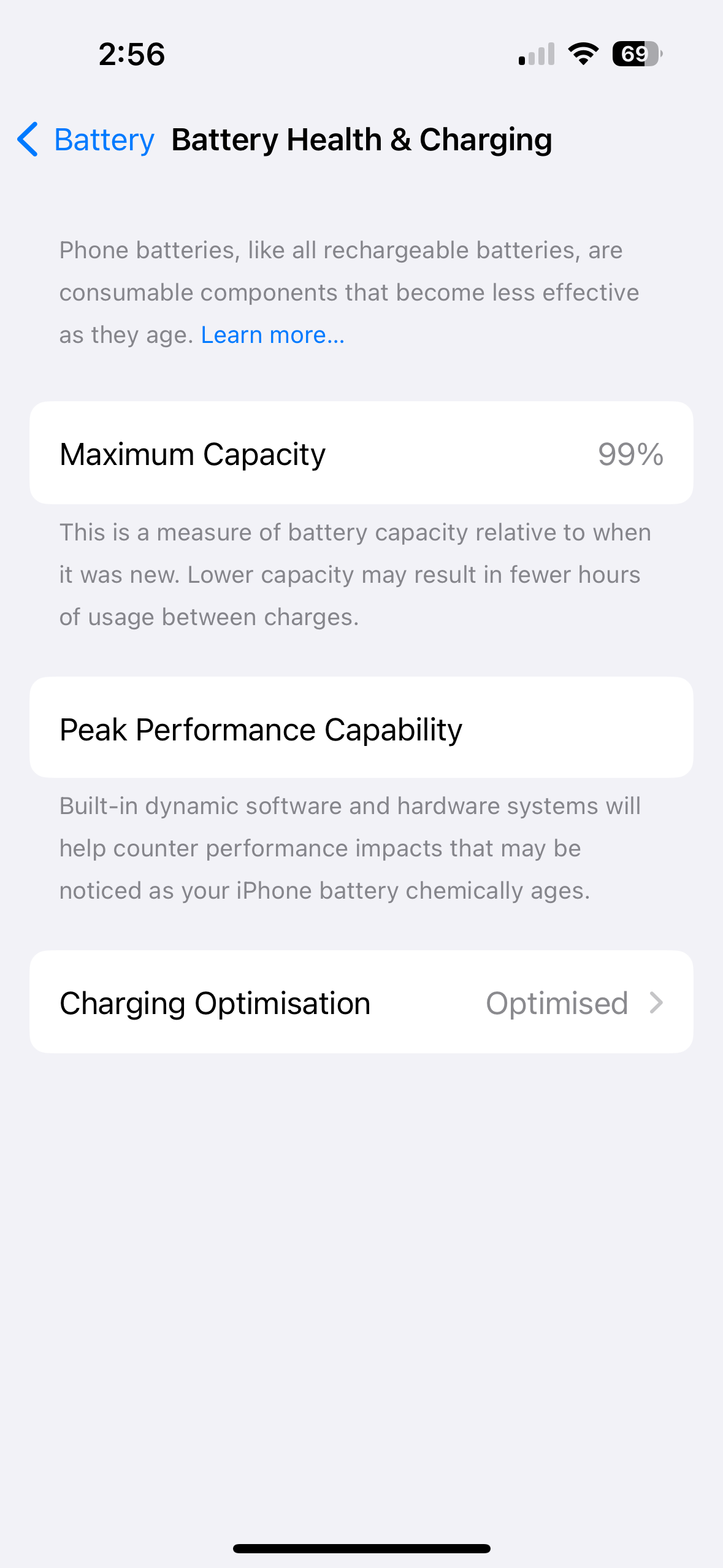 I’ve had iPhone since the 4s & this is the first time I have experienced my iPhone battery health dropped to 99 in less than 2 months & the battery draining quicker than my old iPhone 13 Pro Max that had a battery life of 83% after having it for 2 years. I have always been careful with battery health & hardly charge to 100% and have gone 1-2 days until needing to charge my iPhone.
