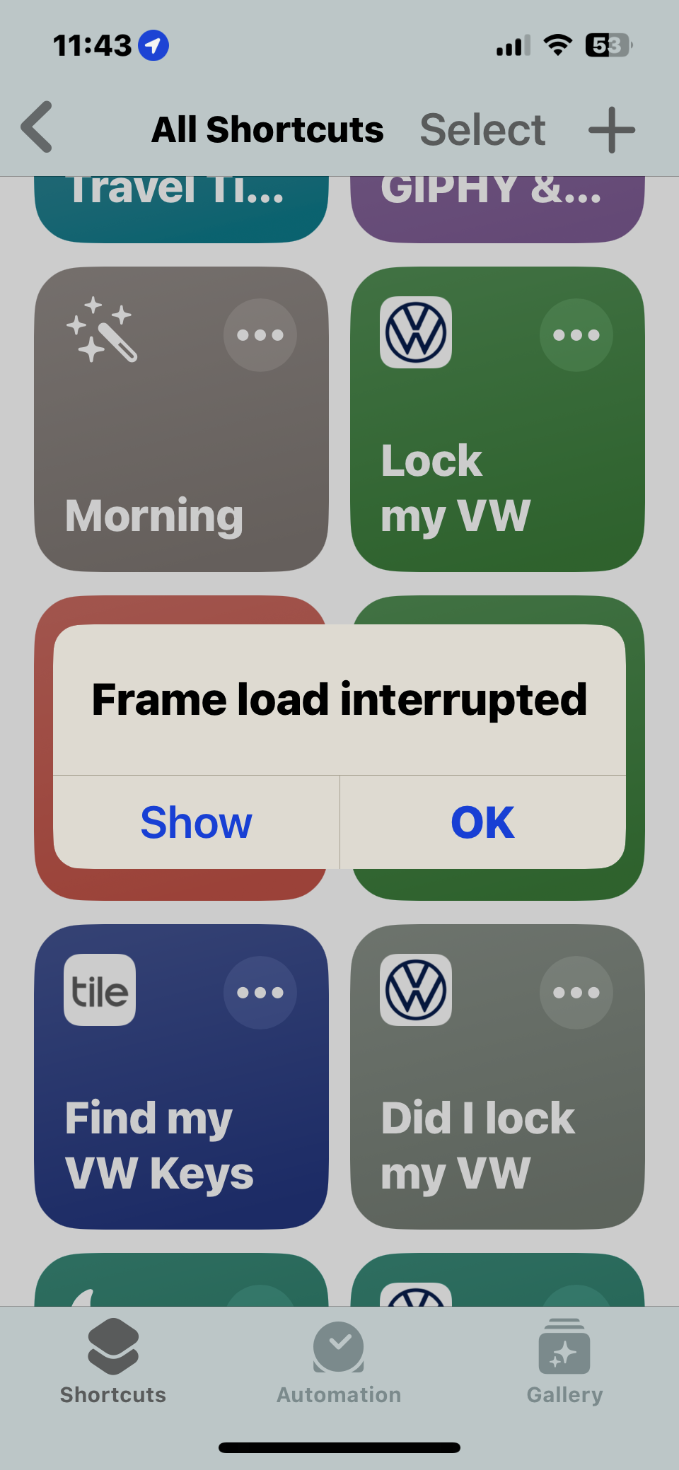 "I have the exact same issue running a shortcut- see my screen grabs: k- cleared history and cache in safari settings, reset my phone, tried both WiFi and cellular, nothing different. the screen grab I sent with the shortcut omitted the addressee; new screen grab attached. thank you!!!"
