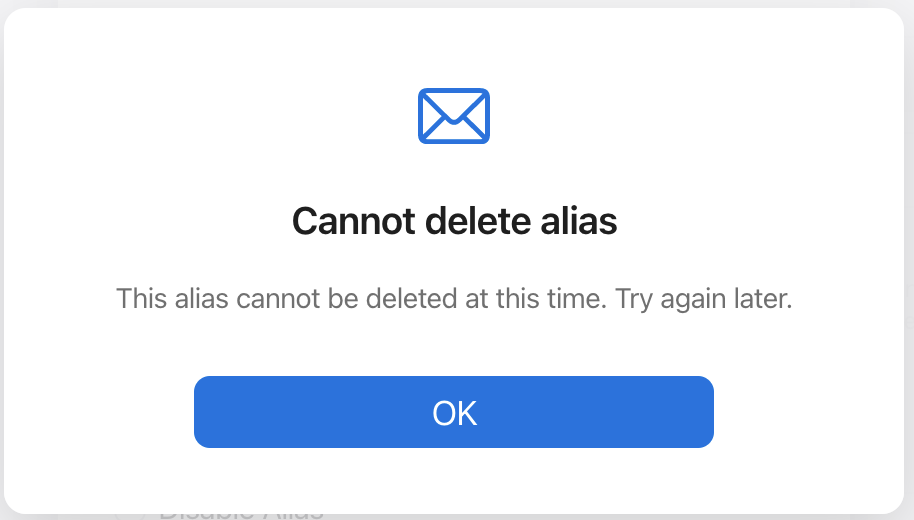For a few years now I have had an iCloud email alias that I created in 2016 or so, to receive spam emails. Last year I didn't need the address anymore so wanted to delete it, however I get weird errors stating their is a server error, or that the alias cannot be deleted at this time. These errors occur on Mac OS, iOS and in my web browser (I have tried Firefox and Safari on both mac and iPhone. All give error messages.)