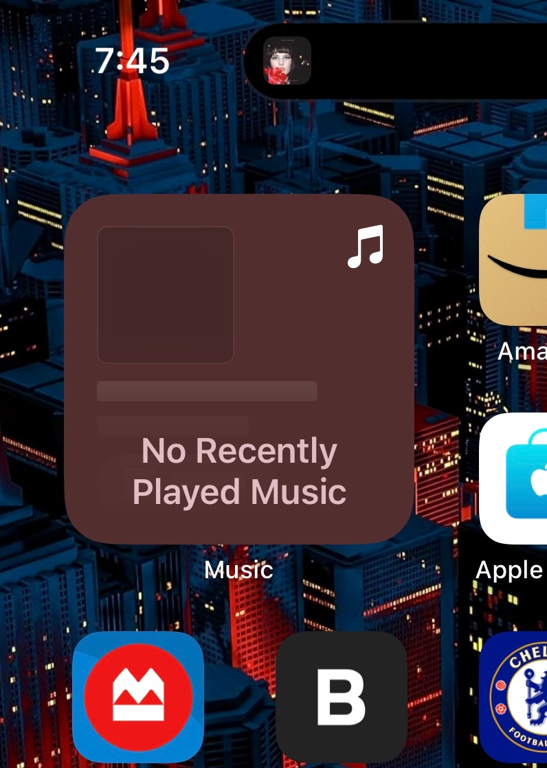 I have had the currently playing on my iPhone’s (15 Pro Max, iOS 17.1) home screen since I’ve had it. But late last week, it now says No Recently Played Music, but it changes colors to match whatever song I’m listening to. Here, the widget is burgundy, matching the colors of Ren Harvieu’s Through The Night.