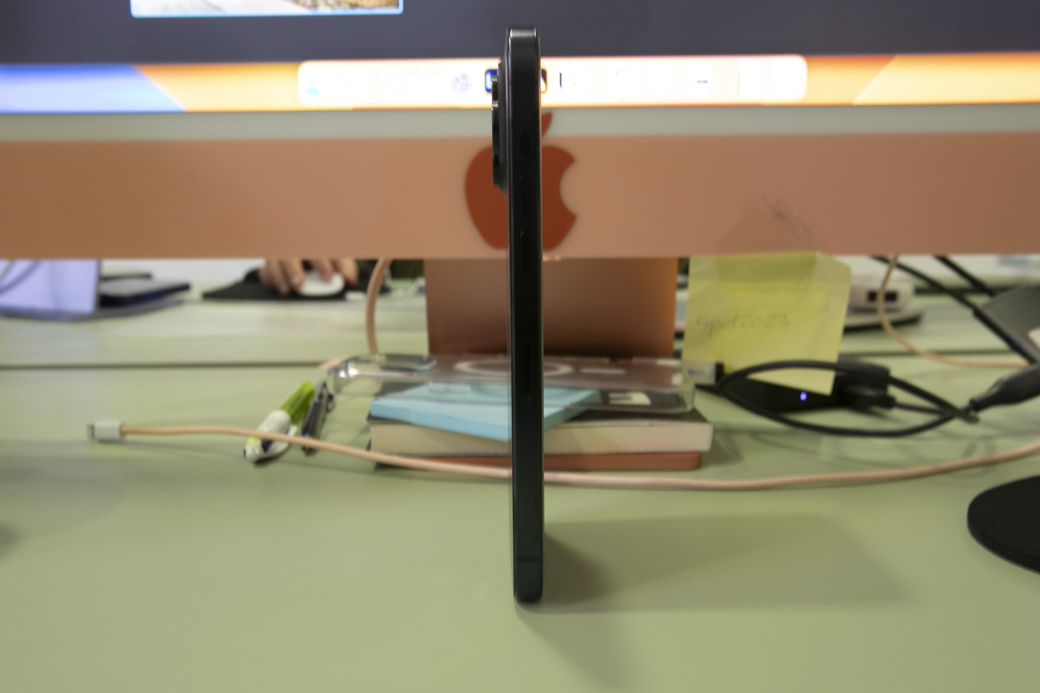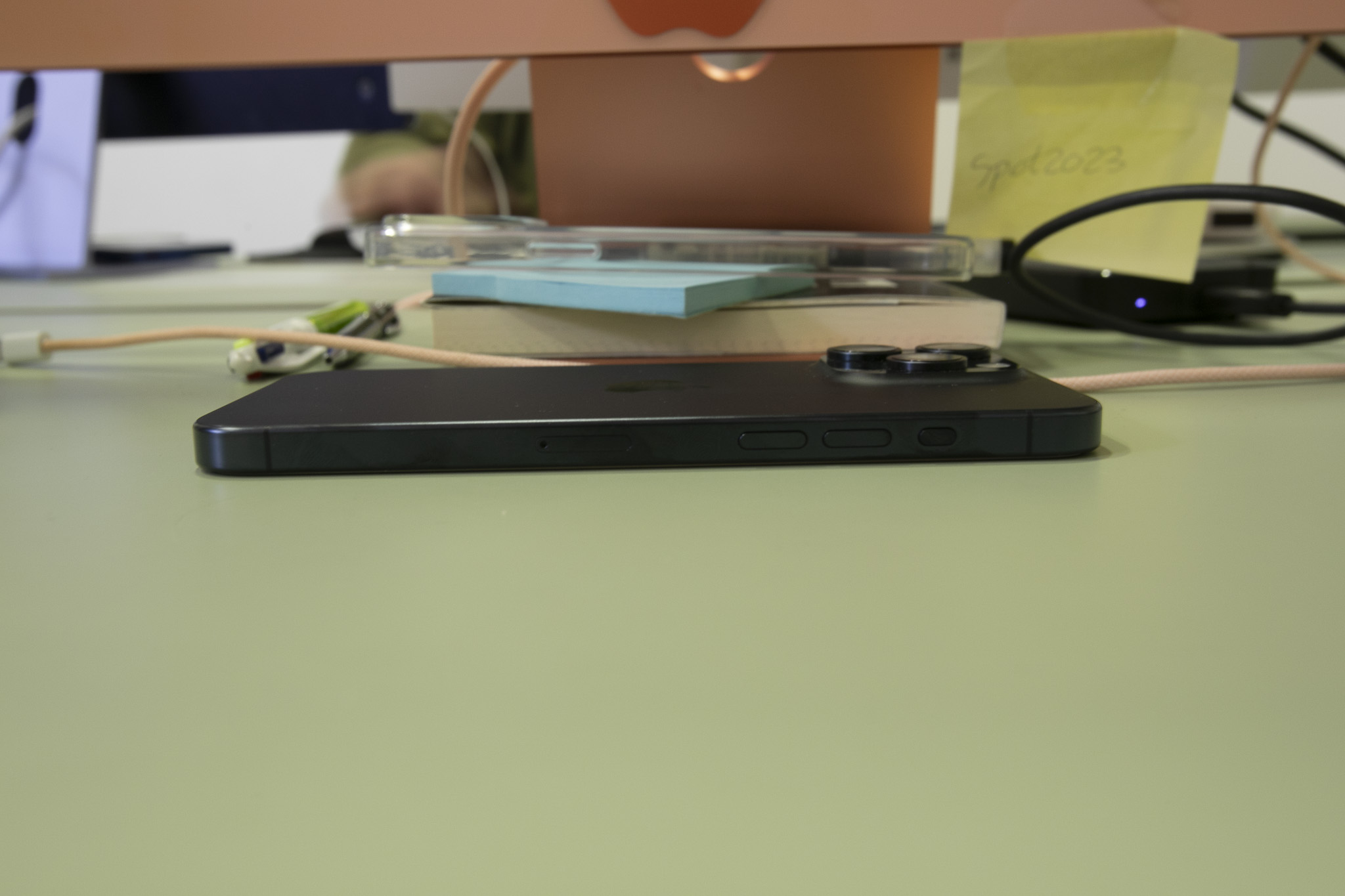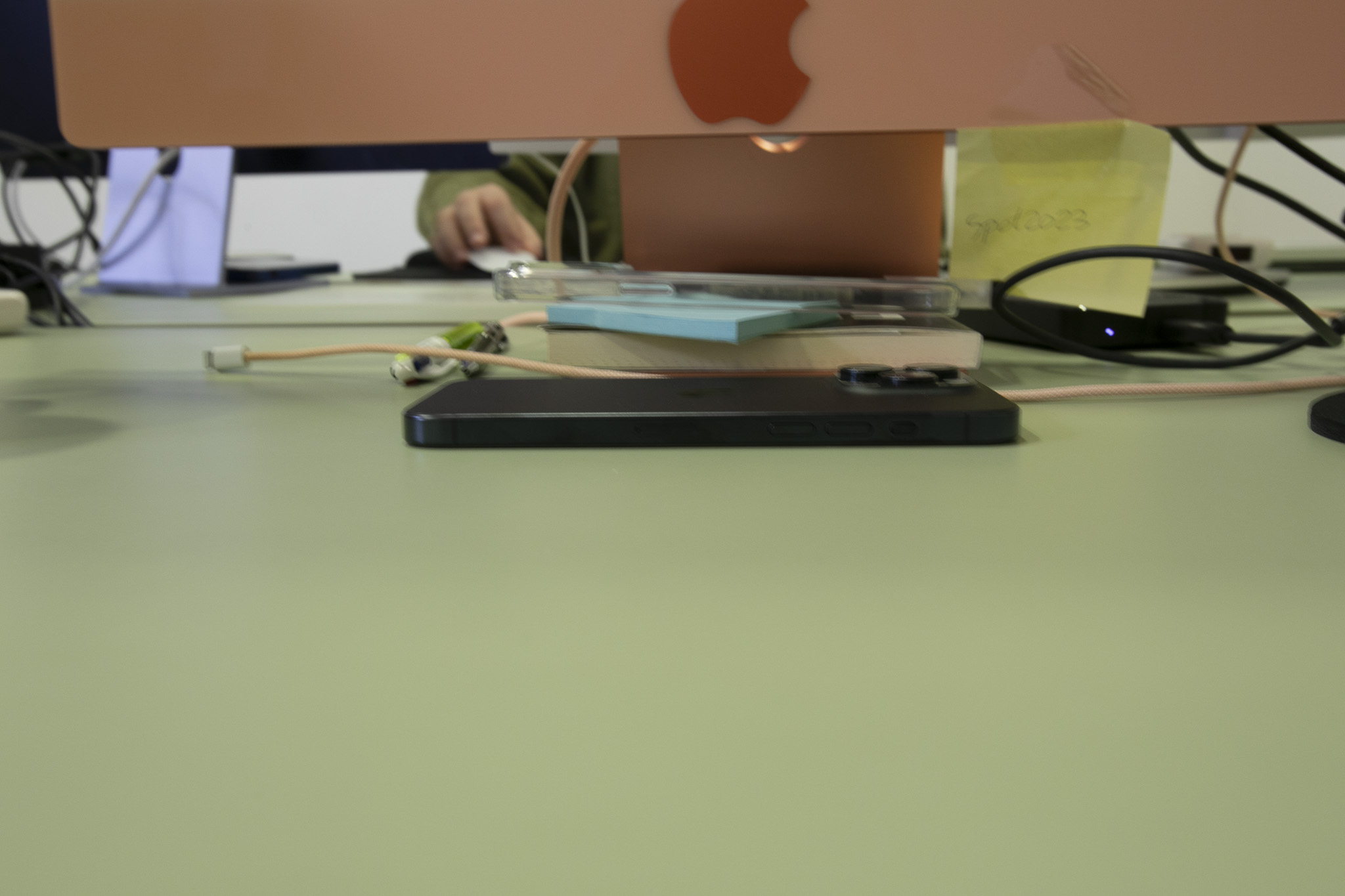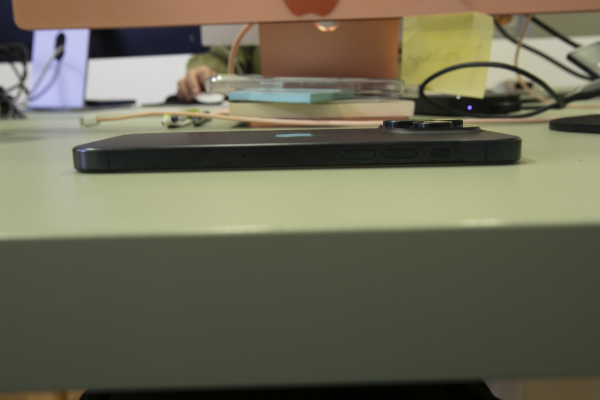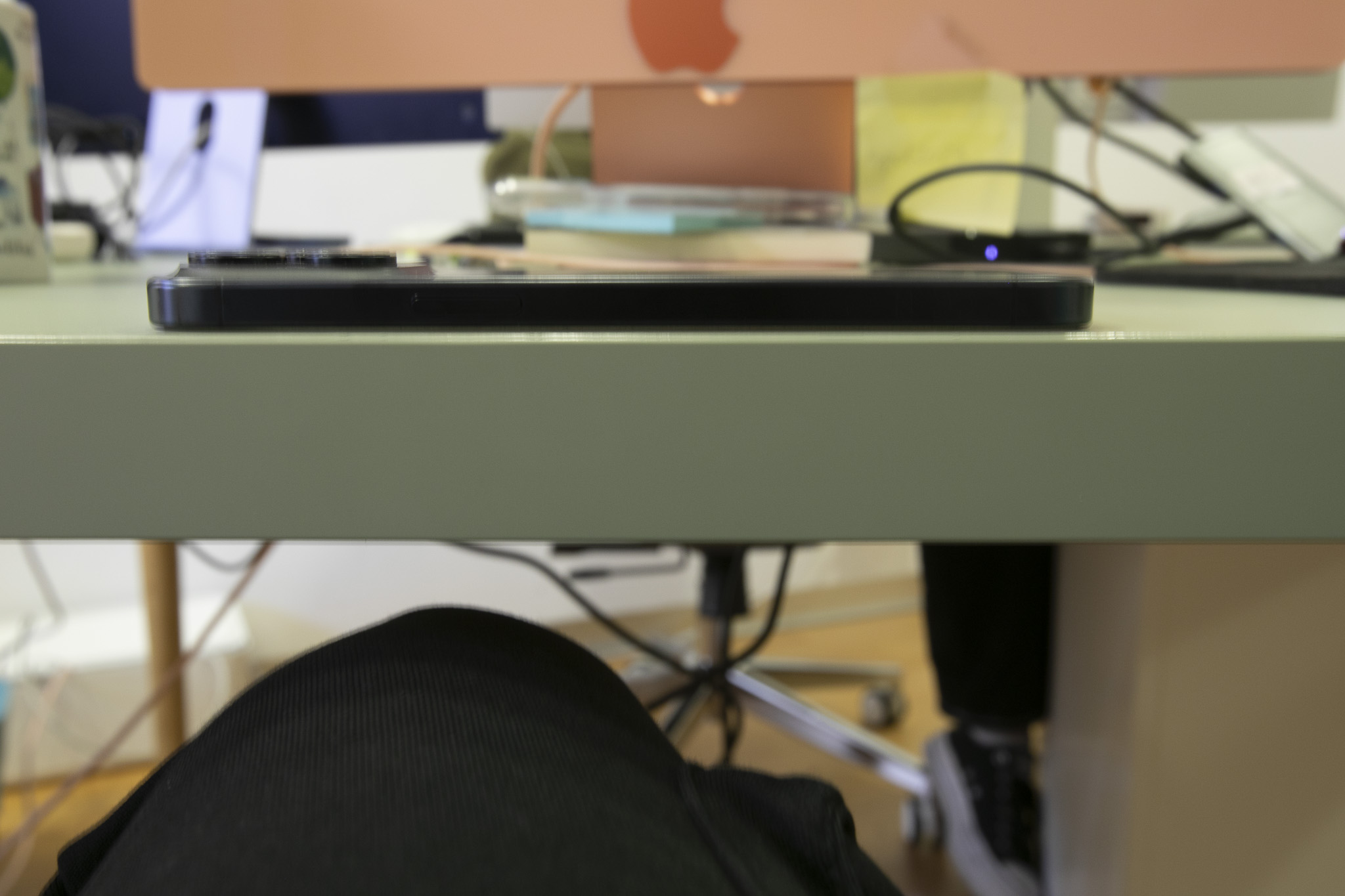 P.S.: attaching some photos, so you could see. For some reason on this particular desk, the phone barely moves, however the described situation is present on every other desk / table I've tried.