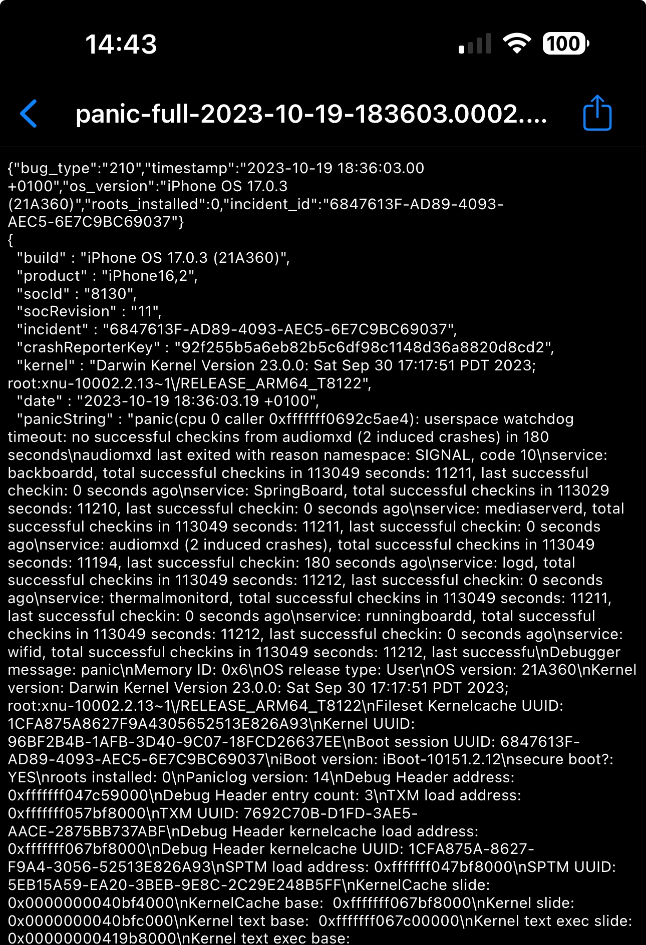 Had my iPhone for about 1 months. Noticed there were 2 panic full reports,(I paired with air pods pro 2 if it is related )this was the most recent one, curious to find out should I be worried?
