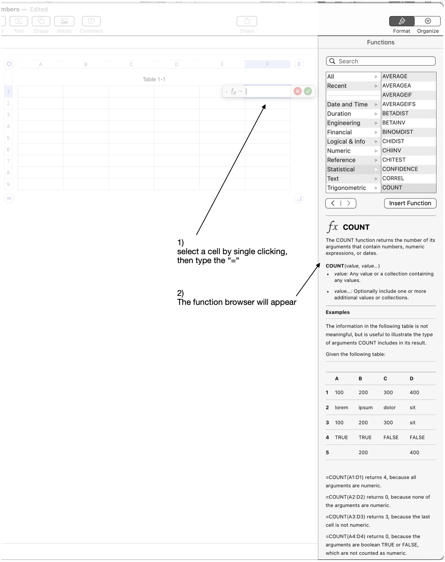 I’m just getting started using Numbers, is there a place that shows common calculations?